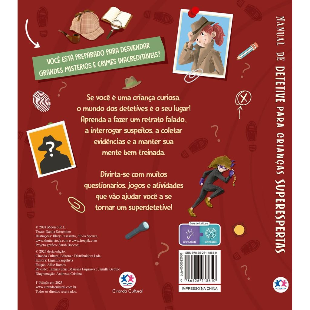 Prepare-se para uma aventura cheia de mistérios, pistas e enigmas! Este manual é ideal para crianças curiosas que adoram desvendar casos e se tornar superdetetives. Aprenda a criar retratos falados, interrogar suspeitos e coletar evidências, enquanto afia suas habilidades de observação e raciocínio. Com jogos, questionários e atividades desafiadoras, você vai treinar sua mente e se divertir resolvendo mistérios como um verdadeiro investigador!