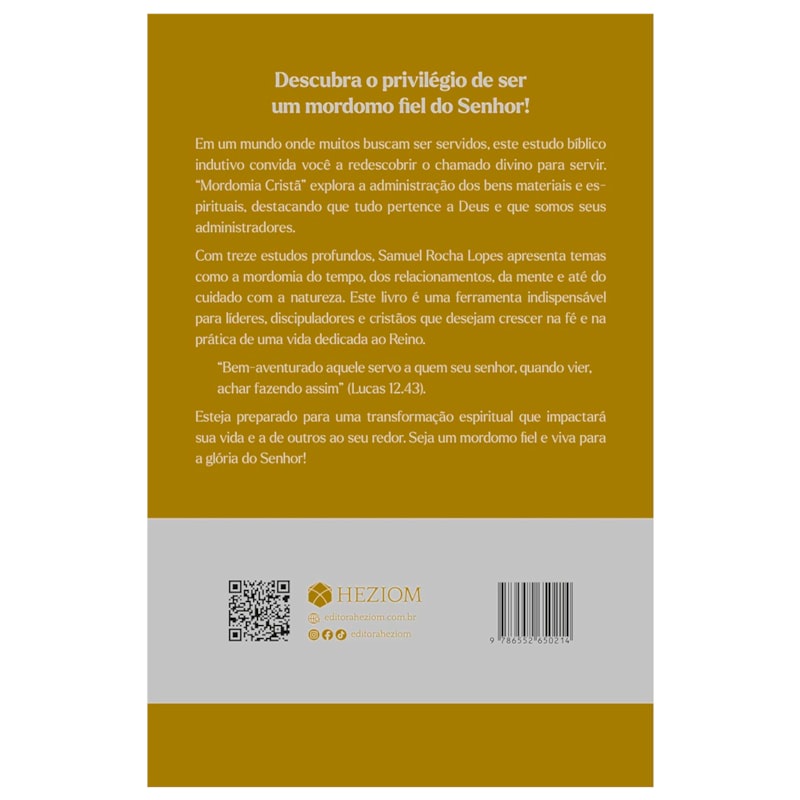 Livro Mordomia Cristã | Samuel Rocha Lopes Série Pastoreio Samuel Rocha Lopes Mordomia Cristã: O Chamado Radical para Servir em um Mundo Centrado em Si Numa sociedade que valoriza o "eu" acima de tudo, este estudo bíblico indutivo apresenta um contraponto transformador: o chamado cristão à mordomia fiel . Revelando que nada nos pertence - nem tempo, talentos ou recursos - esta obra convida a uma revolução de prioridades onde Deus ocupa Seu lugar legítimo: o primeiro. O que você encontrará neste livro: • 13 estudos transformadores que vão muito além da mordomia financeira, abordando: A administração sagrada do seu tempo A mordomia relacional como expressão do amor cristão O cuidado com a mente como santuário do Espírito A responsabilidade ecológica como adoração ao Criador • Fundamentos bíblicos profundos para: Líderes que almejam formar discípulos integralmente fiéis Discipuladores em busca de conteúdo transformador Cristãos comuns que desejam viver com propósito eterno Por que este estudo é diferente? Enquanto muitos tratam a mordomia como mera administração, este livro revela: Como cada área da vida é oportunidade de adoração prática Por que a fidelidade no pouco define nosso destino eterno De que forma o serviço cristão autêntico transforma comunidades "Bem-aventurado aquele servo a quem seu senhor, quando vier, achar fazendo assim" (Lucas 12:43) Prepare-se não apenas para estudar, mas para ser transformado. Esta jornada redefinirá seu conceito de posse, prioridades e propósito eterno. Sua maior descoberta será entender que nada é seu - e que nessa verdade reside a verdadeira liberdade. Especificações do livro Mordomia Cristã | Samuel Rocha Lopes: Título: Mordomia Cristã Subtítulo: Série Pastoreio Autor(es): Samuel Rocha Lopes Ano de Edição: 2025 Capa: Brochura Acabamento: Laminação Brilhosa Miolo: Pólen Páginas: 112 Dimensões: 13,7 x 0,6 x 21 cm Peso: 0,132 kg ISBN: 9786552650214 Editora: Heziom