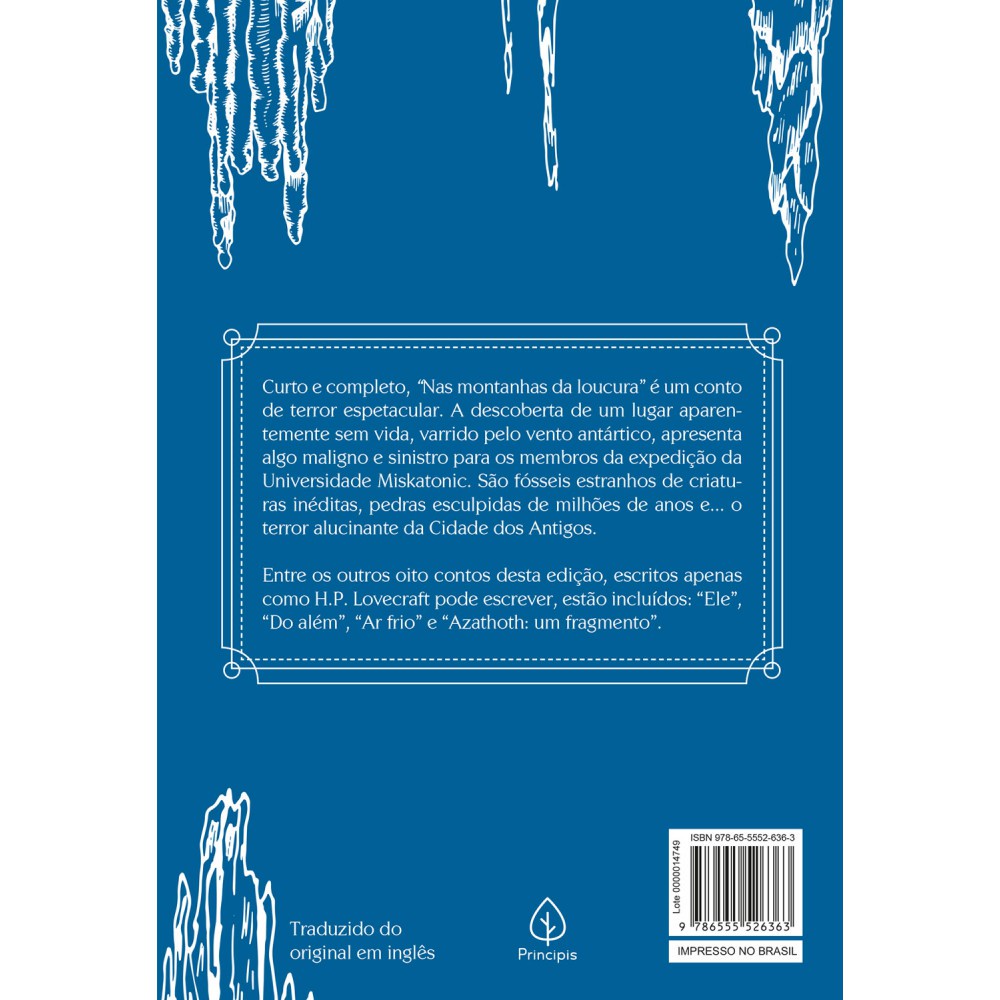 Curto e completo, 'Nas montanhas da loucura' é um conto de terror espetacular. A descoberta de um lugar aparentemente sem vida, varrido pelo vento antártico, apresenta algo maligno e sinistro para os membros da expedição da Universidade Miskatonic. São fósseis estranhos de criaturas inéditas, pedras esculpidas de milhões de anos e... O terror alucinante da Cidade dos Antigos.Entre os outros oito contos desta edição, escritos apenas como H.P. Lovecraft pode escrever, estão incluídos: 'Ele', 'Do além', 'Ar frio' e 'Azathoth: Um fragmento'. Editora: Principis Edição: 1, 2021 Autor: H. P. Lovecraft Idioma: Português Páginas: 192 Dimensões: L 15.50 x A 22.60 x E 1.00 ISBN: 9786555526363