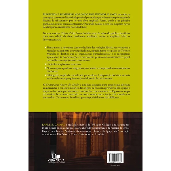PUBLICADA E REIMPRESSA AO LONGO DOS ÚLTIMOS 20 ANOS, esta obra se consagrou como um clássico indispensável para todos que se interessam pelo estudo da história do cristianismo, por ser uma obra magistral. Porém, desde a sua primeira publicação, muitas coisas aconteceram. O mundo mudou e com isso surgiram novos desafios para o cristianismo nos dias de hoje.Por esse motivo, Edições Vida Nova decidiu trazer às mãos do público brasileiro uma nova edição da obra, totalmente atualizada, revista e ampliada. Nela, o leitor encontrará:• Temas novos e relevantes como o declínio das teologias liberal, neo-ortodoxa e radical; o surgimento do evangelicalismo, especialmente nos países do Terceiro Mundo; os desafios que as organizações paraeclesiásticas e as megaigrejas apresentam às denominações; o movimento pentecostal-carismático; o papel das mulheres na igreja atual, entre outros;• Capítulos ampliados e reescritos;• Novos mapas, quadros e diagramas para ajudar a compreender os movimentos históricos;• Bibliografia ampliada e atualizada para colocar à disposição do leitor as mais atuais e relevantes pesquisas na área de história do cristianismo. Páginas: 672