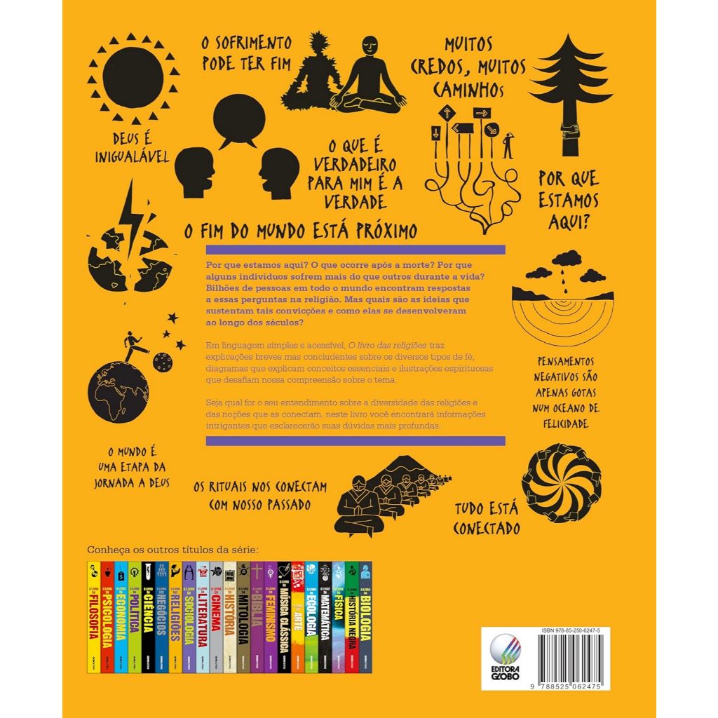 Por que estamos aqui? O que ocorre após a morte? Por que alguns indivíduos sofrem mais do que outros durante a vida? Escrito em linguagem simples e acessível, O livro das religiões é ricamente composto por infográficos, ilustrações e textos atraentes. A obra é fundamental e envolvente tanto para curiosos no assunto quanto para os estudantes mais entusiasmados. O título faz parte da coleção best-seller As grandes ideias de todos os tempos que tem mais de 20 títulos publicados pela Globo Livros e assuntos tão diversos como psicologia, mitologia, filosofia, mitologia, sociologia e história, entre tantos outros. O livro das religiões traz explicações concludentes sobre os diversos tipos de fé, diagramas que explicam conceitos essenciais e ilustrações espirituosas que desafiam nossa compreensão sobre o tema.