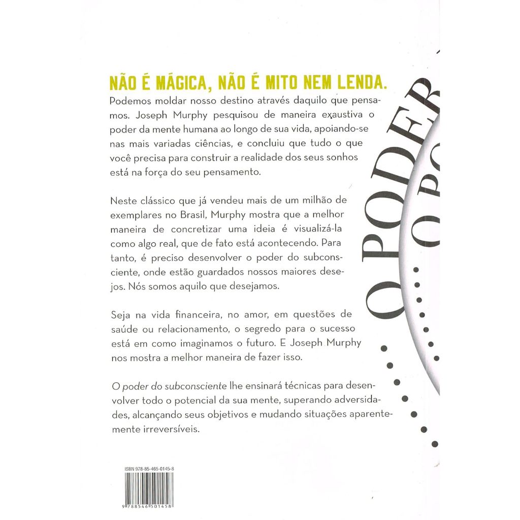 O poder do subconsciente lhe ensinará técnicas para desenvolver todo o potencial da sua mente, superando adversidades, alcançando seus objetivos e mudando situações aparentemente irreversíveis. Não é mágica, não é mito nem lenda.  Depois de entender o poder do seu subconsciente, você também pode se desprender de suas inseguranças e abrir um novo mundo de energia positiva.   O poder do subconsciente ajudou milhões de pessoas a alcançarem grandes objetivos apenas mudando a maneira de pensar. As técnicas revolucionárias descritas pelo Dr. Murphy baseiam-se em um princípio simples e prático: Se você acredita em algo sem restrições e faz um retrato disso em sua mente, remove os obstáculos subconscientes para que seu desejo se concretize. Assim, qualquer um pode transformar em realidade aquilo em que acredita.  Uma excelente maneira de ficar familiarizado com as duas funções da sua mente é considerá-la um jardim. Você é um jardineiro e planta sementes (pensamentos) em seu subconsciente o dia inteiro, baseado nos seus pensamentos habituais. Na medida em que você semeia, terá colheitas em seu corpo e ambiente. Cada pensamento é, portanto, uma causa, e cada condicionamento, um efeito. Por essa razão, é essencial que você tome cuidado com todos os seus pensamentos, a fim de ter apenas situações ou condições desejáveis. Quando sua mente pensa corretamente, quando você compreende a verdade, quando os pensamentos depositados em seu subconsciente são construtivos, harmoniosos e pacíficos, o poder mágico do seu subconsciente responderá com situações harmoniosas, circunstâncias agradáveis, tudo o que há de melhor. Quando você começa a controlar seus processos de pensamento, pode aplicar os poderes do subconsciente a qualquer problema ou dificuldade. Em outras palavras, você estará na verdade. Com a descrição de histórias verídicas de sucesso, O poder do subconsciente é um guia para libertar o poder da mente que revela os segredos para melhorar um casamento, vencer medos, eliminar hábitos nocivos, curar pequenos problemas de saúde e obter promoções, prestígio, dinheiro e felicidade pessoal.
