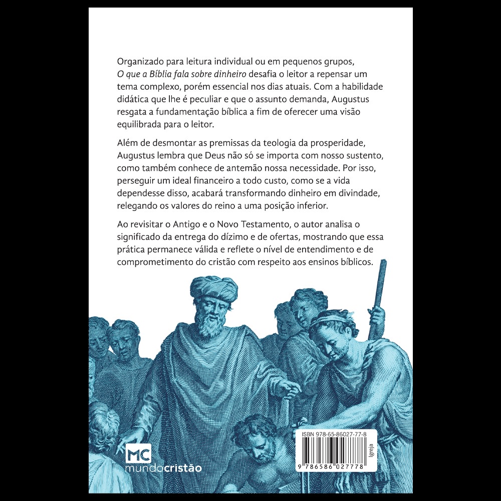 Organizado para leitura individual ou em pequenos grupos, O que a Bíblia fala sobre dinheiro desafia o leitor a repensar um tema complexo, porém essencial nos dias atuais. Com a habilidade didática que lhe é peculiar e que o assunto demanda, Augustus resgata a fundamentação bíblica a fim de oferecer uma visão equilibrada para o leitor.Além de desmontar as premissas da teologia da prosperidade, Augustus lembra que Deus não só se importa com nosso sustento, como também conhece de antemão nossa necessidade. Por isso, perseguir um ideal financeiro a todo custo, como se a vida dependesse disso, acabará transformando dinheiro em divindade, relegando os valores do reino a uma posição inferior.Revisitando o Antigo e o Novo Testamento, o autor analisa o significado da entrega do dízimo e de ofertas, mostrando que essa prática permanece válida e reflete o nível de entendimento e de comprometimento do cristão relativamente aos ensinos bíblicos. Detalhes do produto: Autor: Augustus Nicodemus Lopes Editora: Mundo Cristão Acabamento: Brochura Formato: 14 larg. X 21 alt. Número de páginas: 128