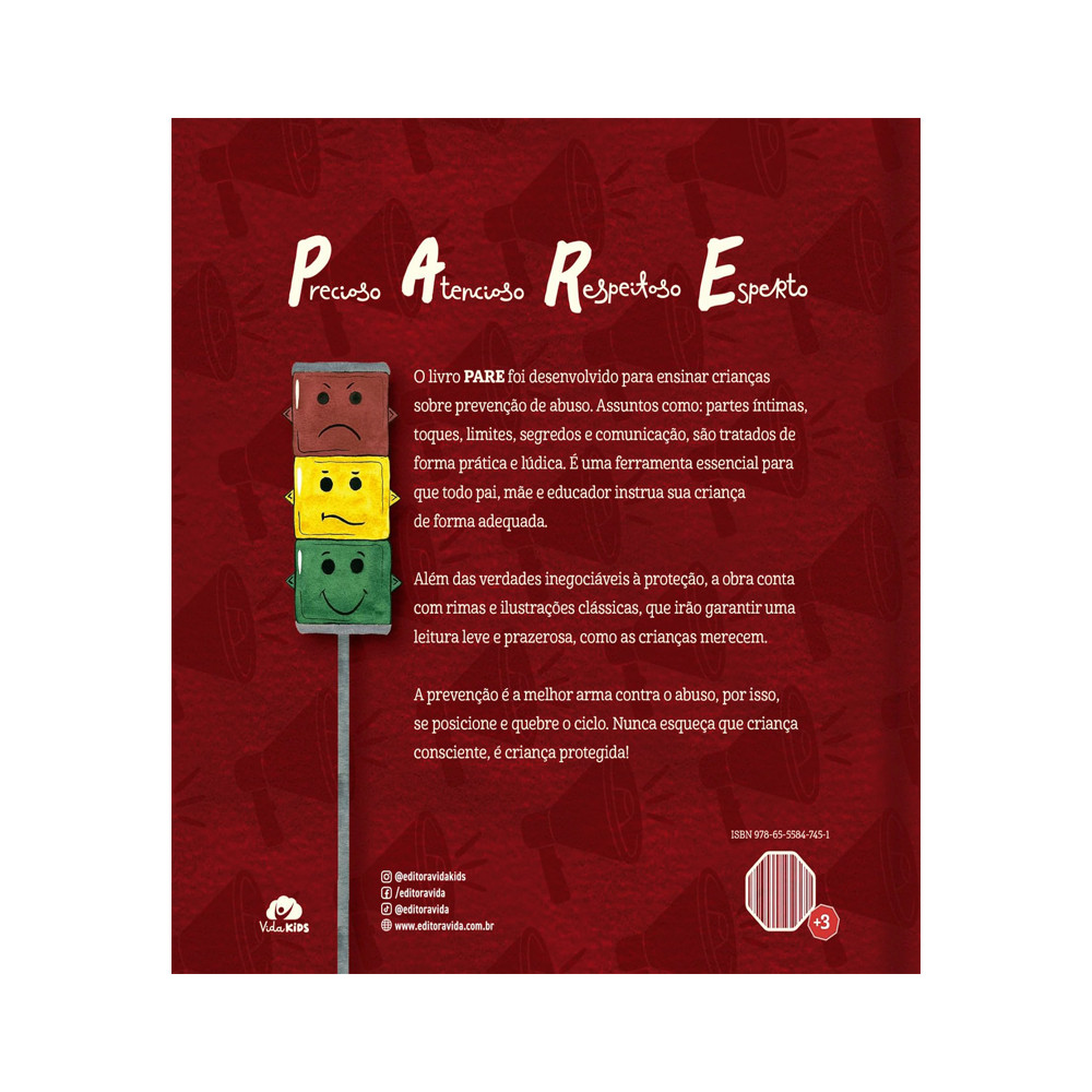 Pare | Vitoria Reis Livro Pare Um Jeito Cristão de Ensinar Prevenção Vitoria Reis "PARE" é um livro infantil que ensina, de forma lúdica e acessível, noções de prevenção ao abuso, abordando temas como partes íntimas, toques, limites e segredos. Com rimas e ilustrações, é uma ferramenta essencial para que pais, mães e educadores instruam as crianças com segurança e leveza. A obra reforça que a informação é a melhor forma de proteção. Páginas:60Dimensões:20,5 x 20,5 x 1 cm