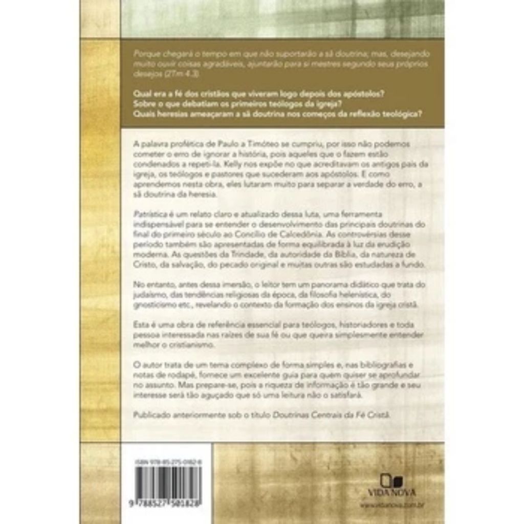 Qual era a fé dos cristãos que viveram logo depois dos apóstolos? Sobre o que debatiam os primeiros teólogos da igreja? Quais heresias ameaçaram a sã doutrina nos começos da reflexão teológica? Este livro é uma ferramenta indispensável para se entender o desenvolvimento das principais doutrinas do final do primeiro século ao Concílio de Calcedônia. As controvérsias desse período também são apresentadas de forma equilibrada à luz da erudição moderna. As questões da Trindade, da autoridade da Bíblia, da natureza de Cristo, da salvação, do pecado original e muitas outras são estudadas a fundo. Prepare-se, pois a riqueza de informação é tão grande e seu interesse será tão aguçado que só uma leitura não o satisfará. Publicado anteriormente sob o título Doutrinas Centrais da Fé Cristã. Detalhes do produto: Autor: J. N. D. Kelly Editora: Vida Nova Acabamento: Brochura Formato: 16 larg. X 23 alt. Número de Páginas: 408