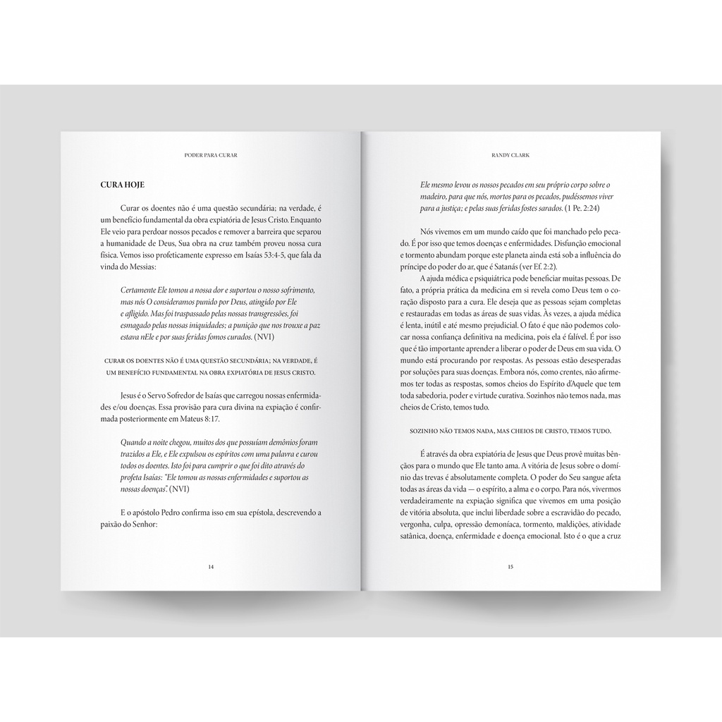 “Eu acredito que Deus desejava que o ministério de cura fosse um assunto de grande importância na vida dos crentes, não uma questão periférica. Jesus quer que sejamos discípulos que abraçam tudo o que Ele nos ordenou a fazer, não que escolhem algumas partes. Quando você estuda os Evangelhos e examina a igreja primitiva, vê que a cura era uma parte normativa da vida da Igreja primitiva, e não alguma prática incomum relegada aos poucos e aos santos. Jesus é para ser nosso modelo em todas as coisas. Ele curou os doentes e nós precisamos seguir o modelo Dele. O ministério da cura é o discipulado básico de Cristo. Eu considero isso discipulado. Infelizmente, o ministério de cura foi perdido por grande parte da igreja. Alguns acreditam que a cura não é para hoje; isso é, cessou com o estabelecimento da Igreja primitiva. Outros acreditam na cura, mas não estão confiantes de que Deus pode ou vai usá-los para curar os doentes. Nenhum destes pensamentos é verdade. A cura é para a igreja hoje, e Deus vai te usar para curar. Essa é a verdade do Evangelho. Nas próximas páginas, quero ajudá-lo a derrubar as barreiras para a cura que foram erguidas em sua vida e a dar-lhe um ensino prático e bíblico sobre como você pode recuperar o poder de curar os doentes. Minha oração é que a cura volte a ser a norma na Igreja do século vinte e um e em sua vida e na vida de todo crente. É meu grande desejo ajudar todo cristão a aprender a andar no poder sobrenatural do Espírito Santo, como parte normal da vida diária, exercendo todos os dons dados aos crentes. Ao começarmos juntos este estudo, eu quero lhe dar uma sólida base bíblica para o ministério da cura divina, usando as Escrituras para mostrar-lhe como é fácil liberar o poder de Deus para curar. Se você se considera um seguidor e discípulo de Jesus, já está qualificado para andar no poder de cura de Deus. É realmente muito simples. Deus pode usar você para liberar o Seu poder de cura e mudar o mundo ao seu redor, mas tudo começa com o que você acredita sobre suas qualificações para levar o Seu poder. O ministério de cura não é reservado para a elite espiritual. Não era exclusivo dos apóstolos, discípulos ou da Igreja primitiva. Você está qualificado para ser usado por Deus para curar”. — Randy Clark Detalhes do produto: Autor: Randy Clark Editora: Novo Caminho Acabamento: Brochura Formato: 15 larg. X 23 alt. Número de Páginas: 216