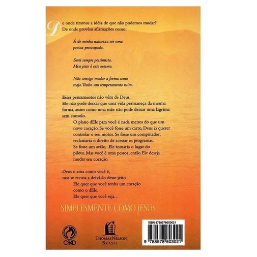 O desejo de Deus, seu plano, seu objetivo supremo, é fazer você à imagem de Cristo. Mas como ocorre esta mudança? Se Deus deseja que eu seja como Jesus, porque ainda me pareço comigo mesmo? Neste livro o autor mostra porque Deus quer mudar o homem e revela seus métodos de transformação. Deus o ama do jeito que você é, mas não quer deixá-lo da mesma maneira. Ele quer que você seja simplesmente como Jesus. Detalhes do produto: Autor: Max Lucado Editora: Cpad Formato: 14,5x22,5cm Acabamento: Brochura Número de páginas: 237