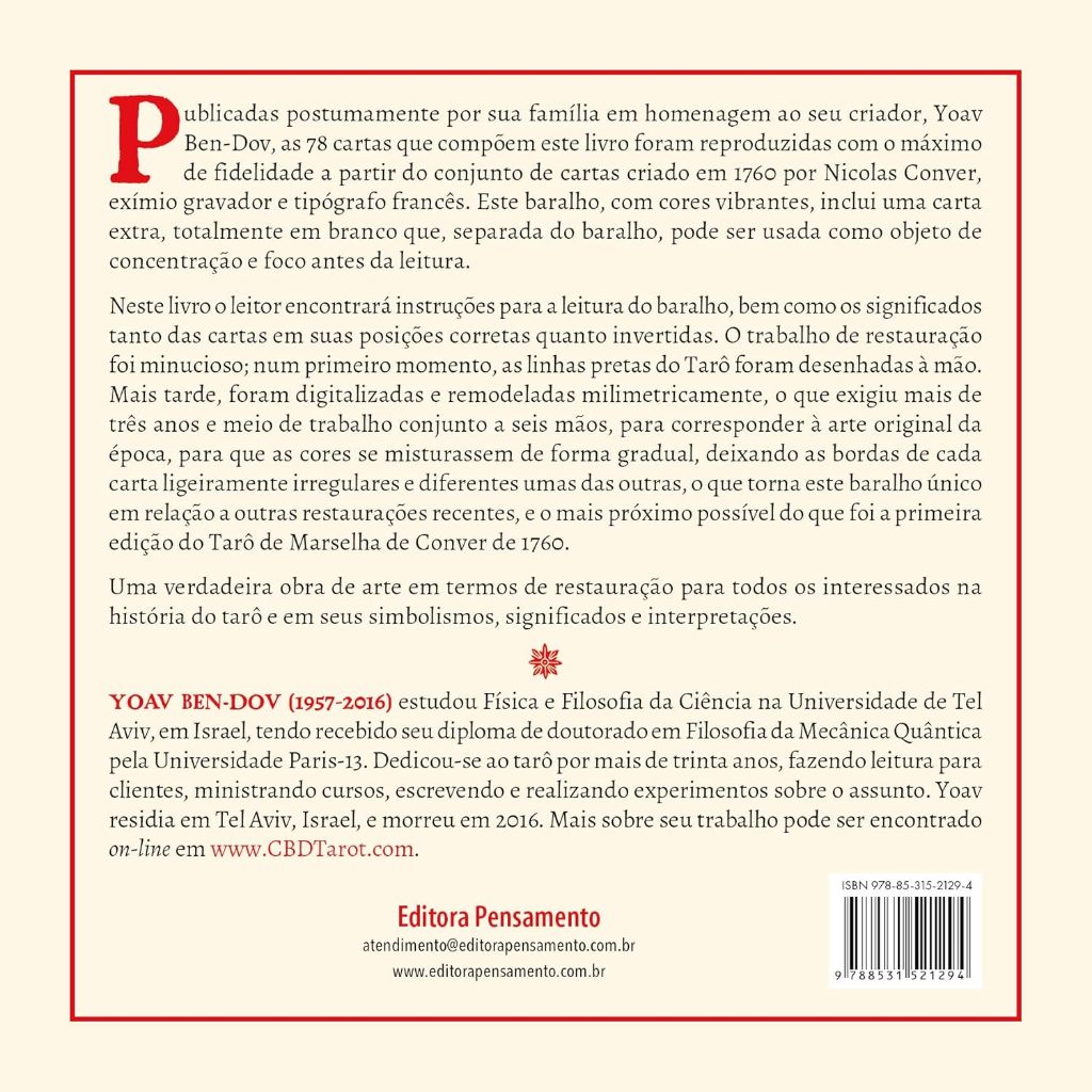 LOJA OFICIAL - LIVRARIA LEITURA PARQUE D.PEDRO - Publicadas postumamente por sua família em homenagem ao seu criador, Yoav Ben-Dov, as 78 cartas que compõem este livro foram reproduzidas com o máximo de fidelidade a partir do conjunto de cartas criado em 1760 por Nicolas Conver, exímio gravador e tipógrafo francês. Este baralho inclui uma carta extra, totalmente em branco que pode ser usada como objeto de concentração e foco antes da leitura. Neste livro, o leitor encontrará instruções para a leitura do baralho, bem como os significados tanto das cartas em suas posições corretas quanto invertidas.