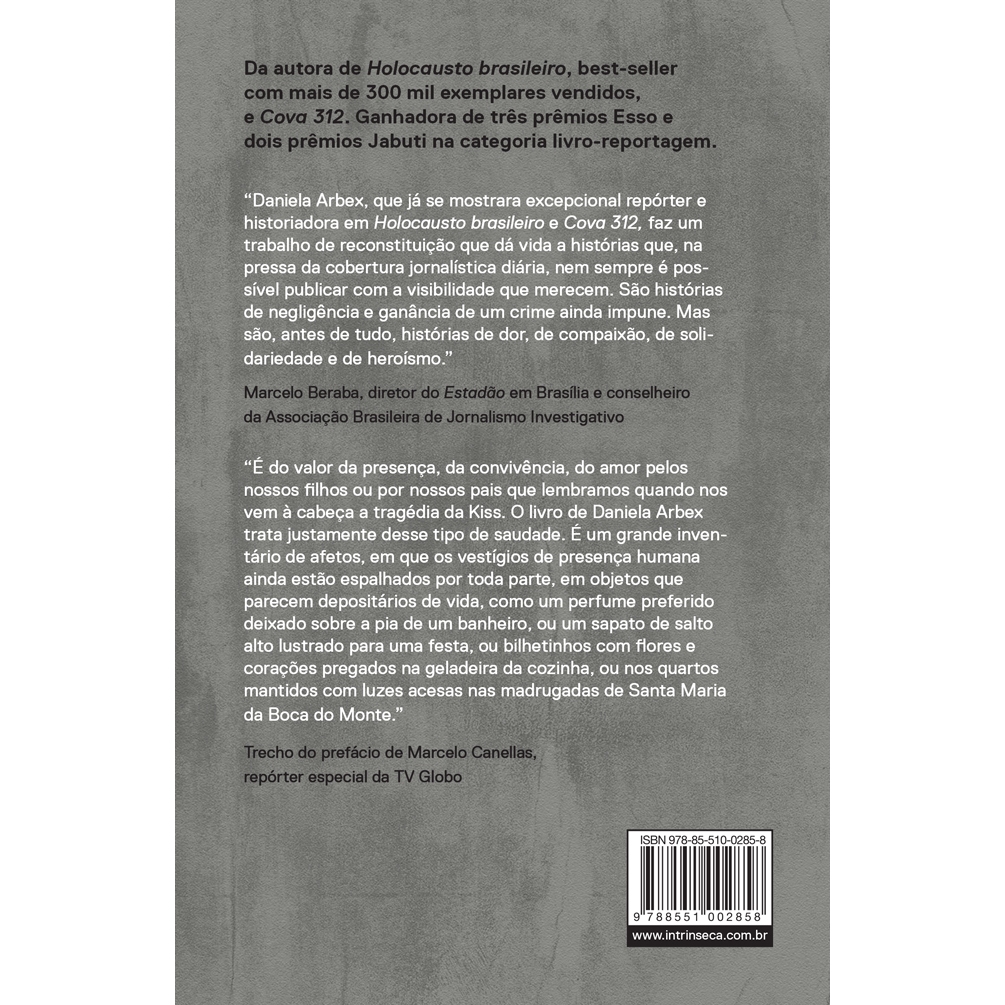 Livro Todo dia a mesma noite (Série da Netflix): A História Não Contada da Boate Kiss, por Daniela Arbex - Intrínseca Reportagem definitiva sobre a tragédia que abateu a cidade de Santa Maria em 2013 relembra e homenageia os 242 mortos no incêndio da Boate Kiss. Daniela Arbex reafirma seu lugar como uma das jornalistas mais relevantes do país, veterana em reportagens de fôlego - premiada por duas vezes com o prêmio Jabuti - ao reconstituir de maneira sensível e inédita os eventos da madrugada de 27 de janeiro de 2013, quando a cidade de Santa Maria perdeu de uma só vez 242 vidas. Foram necessárias centenas de horas dos depoimentos de sobreviventes, familiares das vítimas, equipes de resgate e profissionais da área da saúde - ouvidos pela primeira vez neste livro -, para sentir e entender a verdadeira dimensão de uma tragédia sobre a qual já se pensava saber quase tudo. A autora construiu um memorial contra o esquecimento dessa noite tenebrosa, que nos transporta até o momento em que as pessoas se amontoaram nos banheiros da Kiss em busca de ar, ao ginásio onde pais foram buscar seus filhos mortos, aos hospitais onde se tentava desesperadamente salvar as vidas que se esvaíam. Foi também em busca dos que continuam vivos, dos dias seguintes, das consequências de descuidos banalizados por empresários, políticos e cidadãos. A leitura de Todo dia a mesma noite é uma dolorosa e necessária tomada de consciência, um despertar de empatia pelos jovens que tiveram seus futuros barbaramente arrancados. Enxergá-los vividamente no livro é um exercício que afasta qualquer apaziguamento que possamos sentir em relação ao crime, ainda impune. Sobre o Autor: Daniela Arbex é autora do best-seller Holocausto brasileiro, reconhecido como Melhor Livro-Reportagem do Ano pela Associação Paulista de Críticos de Arte (2013) e segundo melhor Livro-Reportagem no prêmio Jabuti (2014). O livro foi ainda adaptado para documentário pela HBO. Em 2015, lançou Cova 312, vencedor do Prêmio Jabuti na categoria Livro-Reportagem (2016). É seu também Todo dia a mesma noite, livro de 2018 que narra a história não contada da boate Kiss. Daniela foi eleita a melhor repórter investigativa do Brasil em 2020 pelo Troféu Mulher Imprensa e tem ainda outros 20 prêmios nacionais e internacionais no currículo, entre eles três prêmios Esso e o americano Knight International Journalism Award. Foi repórter especial do Jornal Tribuna de Minas por 23 anos e atualmente dedica-se à literatura. Detalhes do Livro: Páginas: 248 Gênero: Biografias e Histórias Reais Formato: 13,5 x 21 x 1,7 Peso: 304,0 gramas Tipo de capa: Livro brochura Data de Lançamento: 19/01/2018