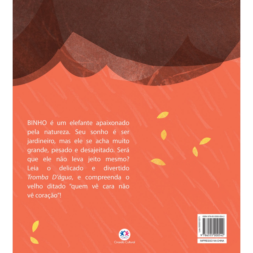 Conheça Binho, um elefante apaixonado pela natureza. Seu sonho é ser jardineiro, mas ele se acha muito grande, pesado, desajeitado. Será que é isso mesmo? Leia o delicado e divertido Tromba d'água e veja como é sempre atual o velho ditado: quem vê cara, não vê coração!. Editora: Ciranda Cultural Edição: 1, 2020 Autor: Leo Cunha Idioma: Português Páginas: 40 Dimensões: L 23.00 x A 26.00 x E 0.40 ISBN: 9786555000542