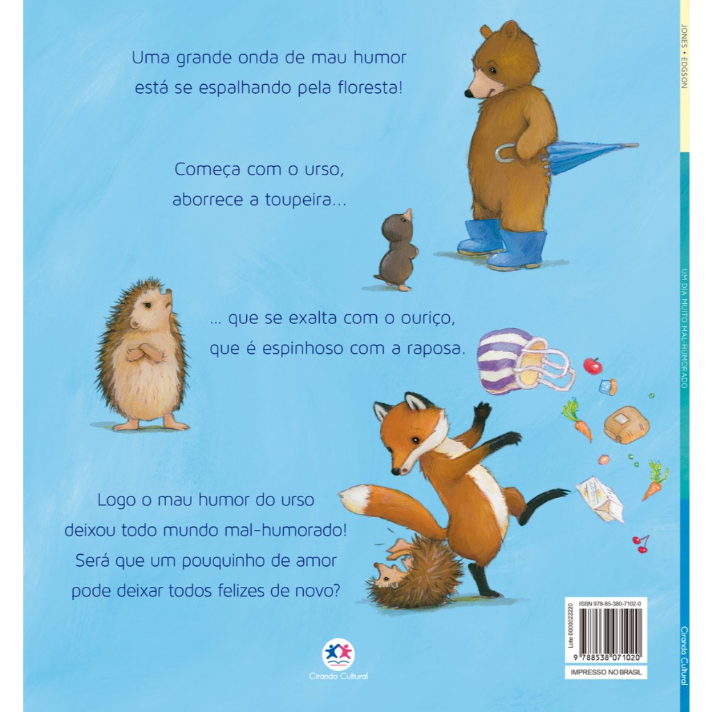 Uma grande onde de mau humor está se espalhando pela floresta! Começa com o urso, aborrece a toupeira... que se exalta com o ouriço, que é espinhoso com a raposa. Logo o mau humor do urso deixou todo mundo mal-humorado! será que um pouquinho de amor pode deixar todos felizes de novo? Editora: Ciranda Cultural Edição: 1, 2017 Autor: Stella J. Jones Idioma: Português Páginas: 32 Dimensões: L 24.60 x A 28.00 x E 0.30 ISBN: 9788538071020
