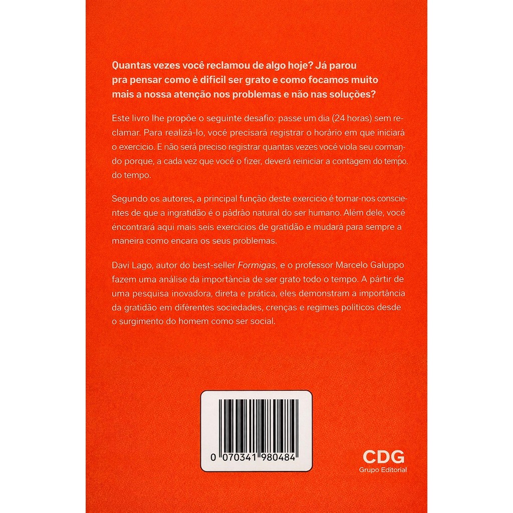 Livro novo e lacrado Quantas vezes você reclamou de algo hoje? Já parou pra pensar como é difícil ser grato e como focamos muito mais a nossa atenção nos problemas e não nas soluções? Este livro lhe propõe o seguinte desafio: passe um dia (24 horas) sem reclamar. Para realizá-lo, você precisará registrar o horário em que iniciará o exercício. E não será preciso registrar quantas vezes você viola seu comando porque, a cada vez que você o fizer, deverá reiniciar a contagem do tempo. Segundo os autores, a principal função deste exercício é tornar-nos conscientes de que a ingratidão é o padrão natural do ser humano. Além dele, você encontrará aqui mais seis exercícios de gratidão e mudará para sempre a maneira como encara os seus problemas. Davi Lago, autor do best-seller Formigas, e o professor Marcelo Galuppo fazem uma análise da importância de ser grato todo o tempo. Detalhes do Produto Ano de publicação: 2024 Com índice: Sim Capa do livro: Mole Número de páginas: 153.