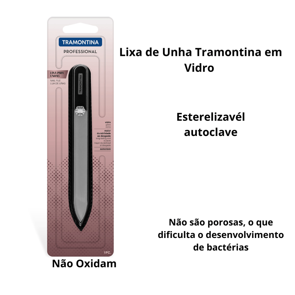 Lixa de Unha de Vidro Tramontina – Suavidade e Durabilidade Garanta unhas impecáveis com a Lixa de Unha Tramontina em Vidro com Capa Protetora de Veludo. Com tecnologia avançada, essa lixa proporciona durabilidade superior e um acabamento preciso, sem rebarbas ou danos à lâmina ungueal. Alta durabilidade, resistente ao desgaste, pode ser lavada e reutilizada, mantendo o desempenho por muito mais tempo Textura suave, proporcionando um melhor acabamento para as unhas, evitando pontas irregulares Unhas sem rebarbas, modela com precisão sem descamar ou enfraquecer as unhas Tecnologia avançada, superfície altamente resistente para um lixamento eficiente e delicado Higiênica e segura, não é porosa, dificultando o desenvolvimento de bactérias, além de ser esterilizável em autoclave Não oxida, diferente das lixas metálicas, sua composição em vidro mantém a qualidade sem riscos de ferrugem Fácil higienização, basta lavar com água e detergente neutro antes e após o uso Ideal para todos os tipos de unha, perfeita para unhas quadradas, redondas ou quebradiças, garantindo um acabamento uniforme Compacta e elegante, essa lixa acompanha uma capa protetora de veludo, sendo indispensável no seu kit de cuidados. Perfeita para levar na bolsa ou necessaire e essencial para profissionais da área Cuidados: Produto de vidro, evite quedas ou impactos. Descarte conforme normas de reciclagem vigentes. Perguntas frequentes A lixa de vidro é melhor do que a tradicional? Sim, as lixas de vidro são mais suaves, higiênicas e duráveis. Elas proporcionam um acabamento perfeito sem descamar ou enfraquecer as unhas. Como limpar a lixa de vidro? Lave com água e detergente neutro. Para maior segurança, pode ser esterilizada em autoclave. A lixa de vidro pode ser usada em unhas artificiais? Sim, ela é eficaz para modelar unhas naturais e artificiais sem causar danos. Qual a durabilidade da lixa de vidro? Se bem cuidada, pode durar anos, pois não desgasta facilmente como as lixas convencionais. Ela solta aquele pozinho branco ao lixar? Não, diferente das lixas comuns, a lixa de vidro evita resíduos excessivos, deixando um acabamento limpo e uniforme. Garanta já a sua Lixa de Unha de Vidro Tramontina e tenha sempre unhas bem cuidadas com máxima precisão e durabilidade. LOJAS MONTRE
