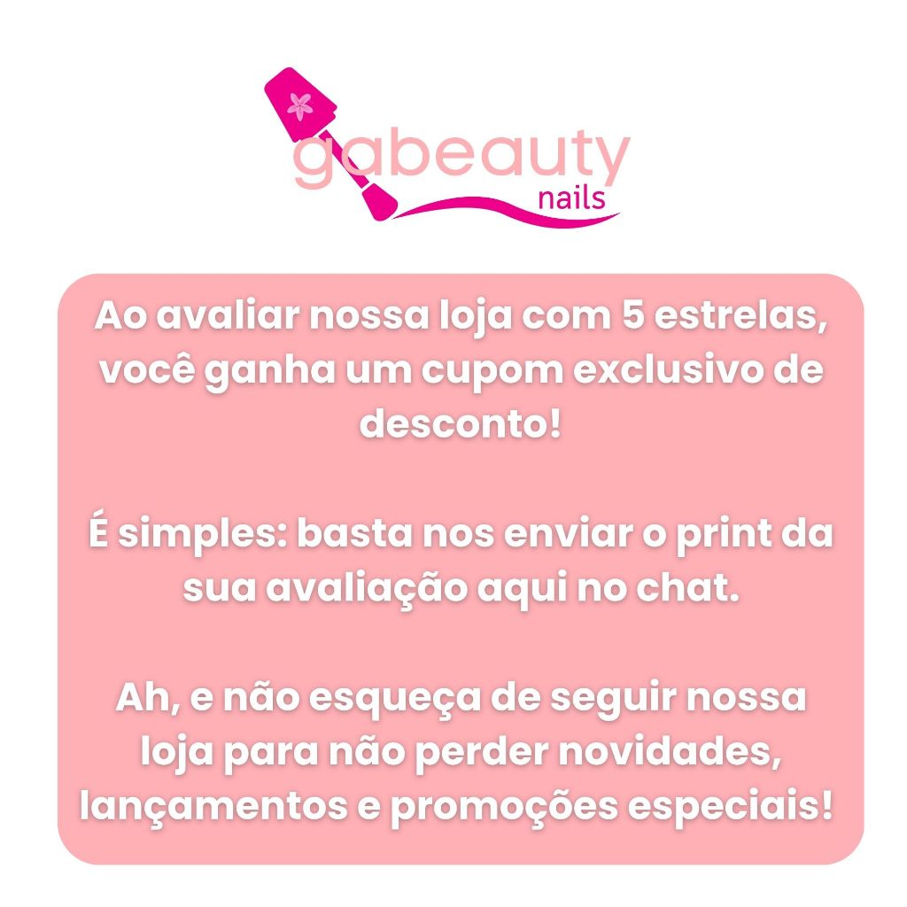 🎁 Mimo Surpresa Especial para Clientes Ao comprar em nossa loja, você pode receber um Mimo Surpresa como forma de agradecimento! O Mimo é enviado de forma aleatória e pode incluir itens como: esmaltes, lixas, palitos para unhas ou outros acessórios de cuidados pessoais, conforme disponibilidade em estoque. 📌 Informações Importantes: Envio aleatório Não é possível escolher modelo ou item Quantidade limitada Sujeito à disponibilidade promocional sem valor comercial ✅ Vantagens Demonstração de carinho com seu pedido Mimo Torna sua compra ainda mais especial Pode variar a cada envio 📦 Enviado junto ao pedido, sem custo adicional. 💬 Ficou com dúvida? Fale conosco no chat!