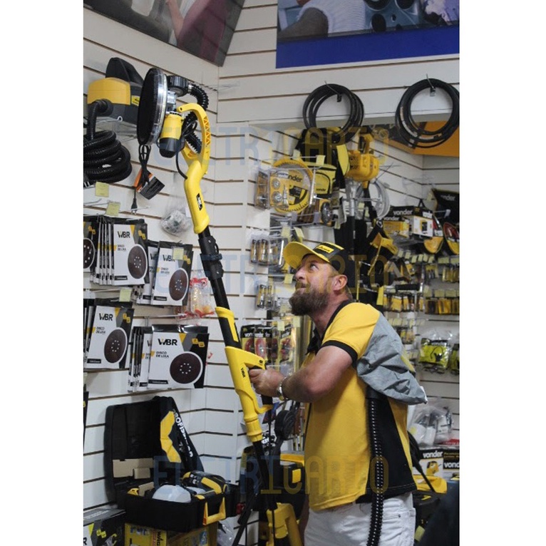 Lixadeira Telescópica Para Teto e Parede 750WWBR com Lixas Grão80, Grão60, Grão240, Grão180, Grão150 e Grão120 (total 67 lixas) Wagner A lixadeira telescópica modelo 873292 da marca WBR foi projetada para lixamentos de paredes e tetos de alvenaria, gesso e massa corrida. Equipamento leve e compacta para o usuário que procura maior eficiência e poder de alcance maior que as concorrentes. Benefícios da Lixadeira Telescópica WBR - Cabeça articulada para melhor movimentação em qualquer sentido - Cabo dobrável para melhor execução do usuário - Luz de led de 12 V e potência 8,4 W para melhor visão da superfície - Adaptador para coletor de pó com diâmetro de 40 mm - Adaptador para mangueira com diâmetro de 47 mm - Botão de ajuste de velocidade, com 5 níveis - Dupla isolação - Comprimento da Lixadeira SEM Cabo de Extensão (para ambientes menores): 1,10 m - Comprimento da Lixadeira COM Cabo de Extensão (para tetos): Ajustável de 1,10 m a 1,80 m - Possui cabo elétrico de 4 m dispensando, na maioria das vezes, o uso de extensões - Encaixe da mangueira flexível de 1,10 m - Sistema de sucção realizado por 8 furos ou pela circunferência ao redor da base do disco da lixa -Tensão: 127/220V - Selecionar no ato da compra (se disponível) -Velocidade: 5 níveis - 1850rpm Acompanham a Lixadeira Telescópica - 01 Maleta Plástica - 01 Mangueira flexível para conexão no aspirador de pó de 1,5 m - 01 Adaptador para conexão no aspirador de pó - 01 Chave Allen - 01 Chave de Fenda - Coletor de Pó - 67 Lixas com granulação de 60, 80, 100, 120, 150, 180 e 240 (11 de cada granulação, não sendo possível a substituição de granulação ou escolha de um modelo especifico pelo cliente, podendo de livra escolha da loja mudar alguma granulação para mais ou menos se houve necessidade).