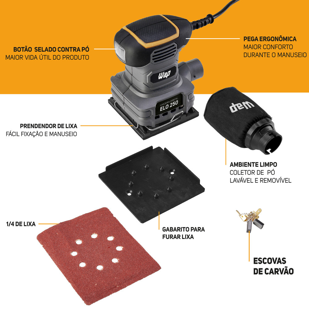 Lixadeira Orbital 250W 14.000 OPM ELO250 WAP Superfícies lisas e bem acabadas com o controle na palma da sua mão. A Lixadeira Orbital WAP ELO 250 conta com 250W de potência e foi desenvolvida para oferecer conforto, desempenho e menor esforço na hora de realizar lixamentos em paredes ou dar acabamento em peças diversas. Possui base fabricada em polímeros e borracha, resistente e ideal para lixar madeira maciça, MDF/MDP cru, paredes, gesso, alvenaria, metal e outros materiais que exigem acabamento uniforme e preciso. Acompanha 1 saco reutilizável coletor de pó, 1 gabarito para furar lixa, 1 lixa e 2 escovas de carvão para reposição. Conta com cabo elétrico de 1,7 metros, garantindo maior mobilidade durante o uso, e opera com velocidade de 14.000 órbitas por minuto (OPM). A base da lixa equivale a 1/4 de uma lixa convencional, permitindo que uma lixa padrão seja dividida em quatro partes iguais, facilitando a reposição sem necessidade de ajustes adicionais. Sua empunhadura ergonômica e emborrachada proporciona maior conforto e controle, reduzindo a vibração e garantindo um lixamento mais consistente. Leve e prática, a Lixadeira Orbital WAP ELO 250 possui sistema de grampos para fixação da lixa, permitindo troca rápida e segura. O botão liga/desliga selado contra pó contribui para maior durabilidade do equipamento. Ferramenta indispensável para qualquer bancada de trabalho. Aplicações: • Lixar madeira • Lixar paredes • Lixar gesso e alvenaria • Lixar metal • Dar acabamento • Preparar superfícies para pintura • Remover pintura Diferenciais: • Pega ergonômica e emborrachada • Botão liga/desliga selado contra pó • Hastes de fixação da lixa • Coletor de pó integrado Acessórios Inclusos: • 01 Saco reutilizável coletor de pó • 01 Gabarito para furar lixa • 01 Lixa • 02 Escovas de carvão Informações Técnicas: • Modelo: ELO 250 • Marca: WAP • Tensão: 127V ou 220V (escolher, conforme disponibilidade) • Potência: 250W • Frequência: 60 Hz • Motor: Universal (com escovas) • Velocidade: 14.000 OPM • Nível de ruído: 83 dB(A) • Classe de isolação: Classe II • Cabo elétrico: 1,7 m • Capacidade do coletor: 240 ml • Filtro coletor: Sim • Velocidade variável: Não • Tipo de filtragem: Gaiola plástica com filtro de pano • Funções: Lixamento e acabamento Dimensões: • Produto (C x L x A): 23,5 x 11 x 15 cm • Base: 110 x 105 mm • Lixa: 145 x 110 mm • Caixa (C x L x A): 12,5 x 19,5 x 15,5 cm Peso: • Aproximadamente 1,4 kg Garantia: • 1 ano de garantia concedido pelo fabricante SKU: 57013