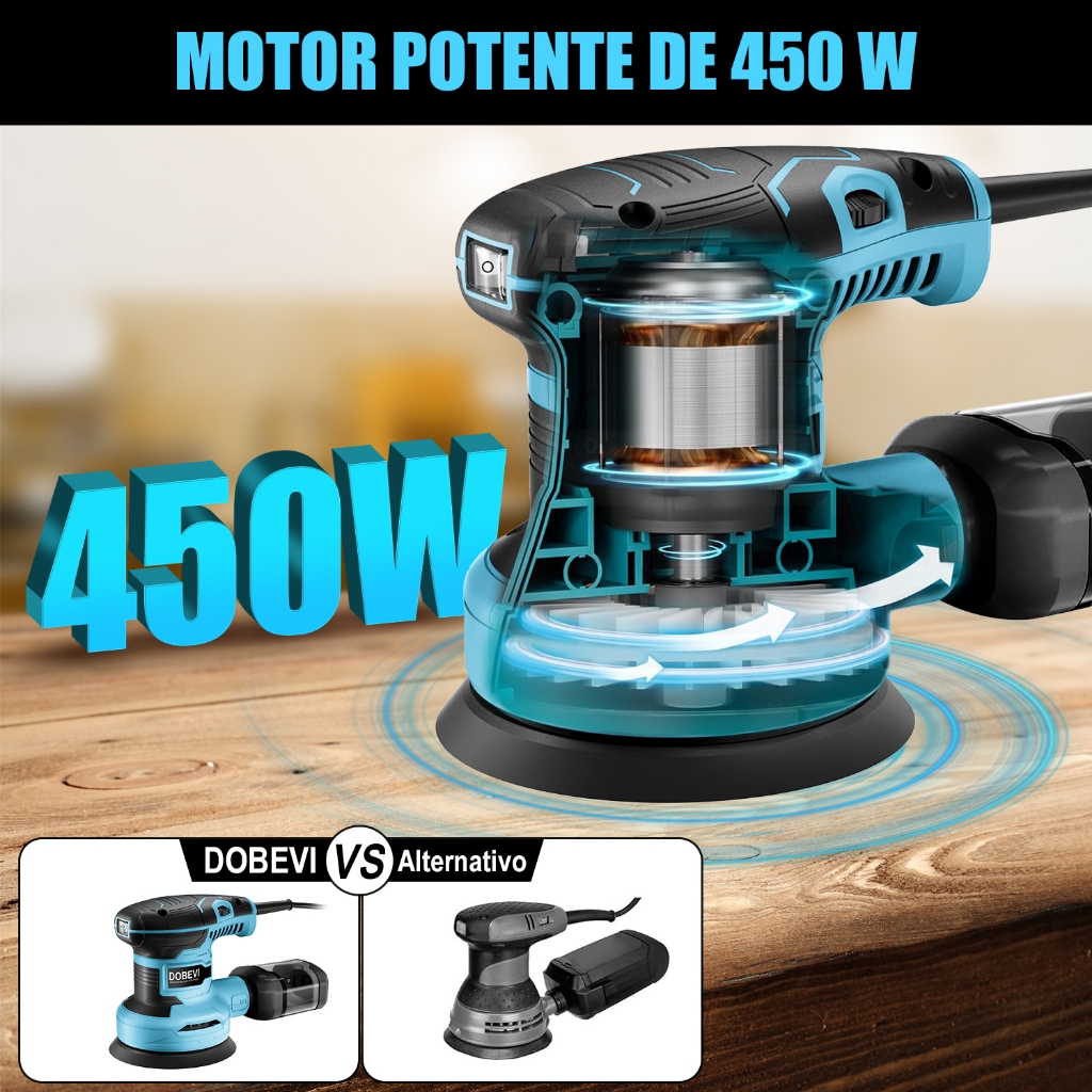 Lixadeira Redonda 450W & 15.000 RPM - 6 Velocidades Ajustáveis + Kit Multiuso com Coletor de Pó Industrial DOBEVI 6 VELOCIDADES VARIÁVEIS: a lixadeira DOBEVI oferece 6 velocidades variáveis para trabalhar na faixa de 7.000 a 15.000 OPM, o que facilita a combinação da velocidade certa, desde o lixamento para madeira até o polimento, com até 30% mais eficiência. 10 PEÇAS DE LIXA: 10 peças de lixa para lixadeira orbital, de grossa a fina, grão120, que podem atender a diferentes cenários de lixamento, polimento, remoção de tinta, remoção de ferrugem e assim por diante. CAIXA TRANSPARENTE DE COLETA DE POEIRA: a lixadeira vem com uma caixa transparente de coleta de poeira, que otimiza a coleta de poeira por meio dos 8 orifícios de vácuo na parte inferior, garantindo 80% de eficiência na coleta de poeira e proporcionando um espaço de trabalho mais limpo. O compartimento de pó é removível e fácil de limpar. Design ergonômico: mini lixadeira orbital leve; a alça moldada revestida de borracha texturizada foi ergonomicamente projetada para operação com uma só mão, absorve choques e reduz a vibração durante a operação, aumentando o conforto e o controle sobre o trabalho. Baixa vibração e alto desempenho: a lixadeira orbital proporciona uma superfície sem redemoinhos e uma textura uniforme com um peso de apenas 3,43 lbs. Desempenho com baixa vibração para um lixamento mais suave. A operação fácil com uma só mão proporciona mais flexibilidade do que outras lixadeiras orbitais. Você pode usá-la para remover tinta ou lixar uma superfície pintada para obter um acabamento brilhante. Além disso, pode remover ferrugem, limpar móveis, remover bordas lascadas da madeira e remover rebarbas de metais recém-cortados. Você receberá: 1 lixadeira elétrica, 10 discos de lixa 120,Se tiver alguma dúvida sobre a lixadeira, entre em contato conosco.