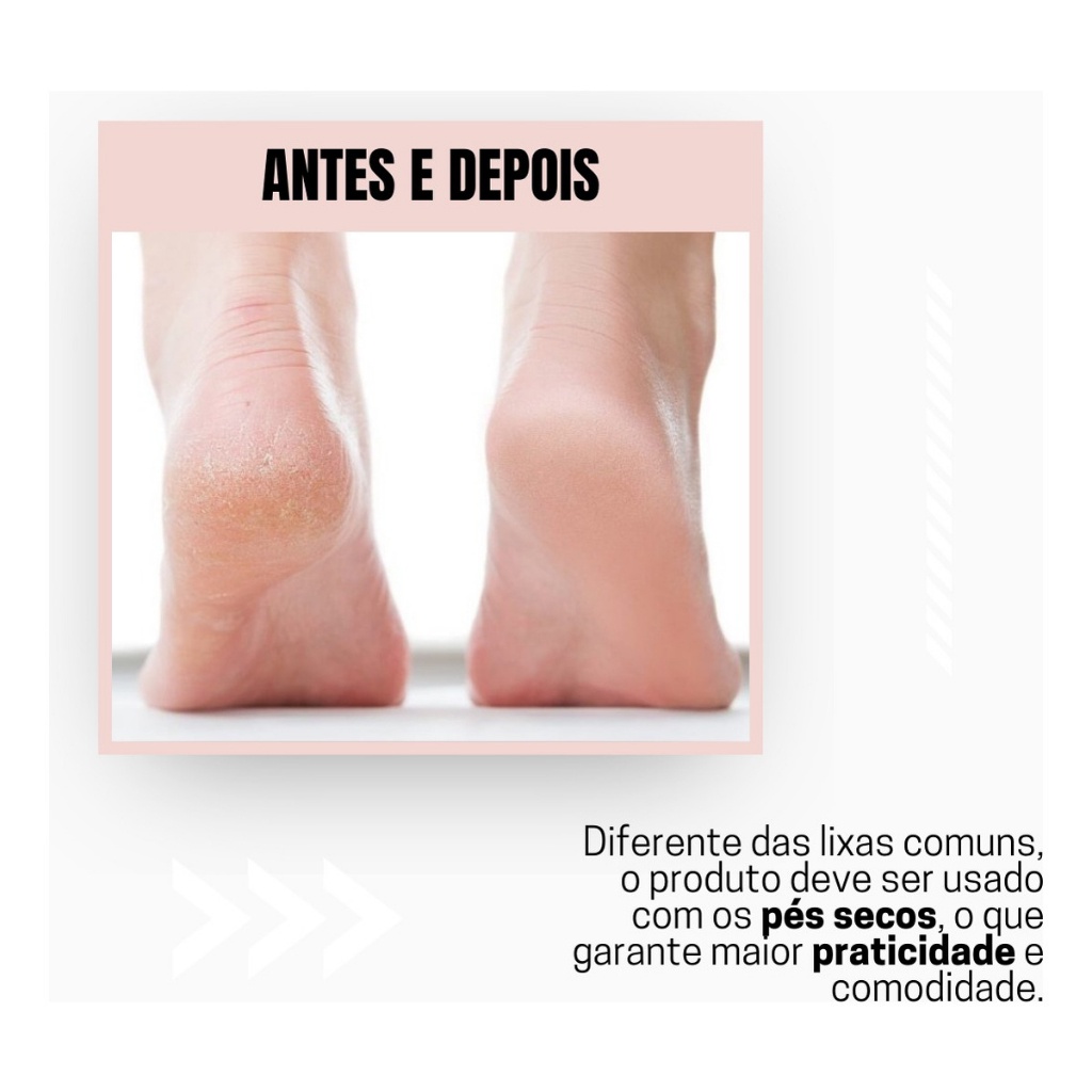 "ATENÇÃO Comprando em 24HRS, o envio é feito no mesmo dia! Pés lisos, macios e sem calos!!! É possível ter pés saudáveis de forma simples! Este produto possui exclusiva tecnologia DERMA VAC que absorve instantaneamente as células mortas da pele. Mantenha sua pele macia e uniforme! Economize dinheiro, com a bateria recarregável USB você não precisa comprar pilhas desnecessárias. Compacto e portátil, você leva seu aparelho para qualquer lugar Desenvolvido por dermatologistas e podólogos, promove a renovação das células da pele com seu sistema de esfoliação, e facilita a cicatrização de calos com sua tecnologia de sucção á vácuo, garantindo a saúde do seu pé, evitando fungos, bactérias e a formação de calos que atrapalham a sua rotina de rendimento! Benefícios : -Aumenta sua autoestima -Pé sem rachaduras, calos ou ressecados -Efeito relaxante e terapêutico -Renovação e esfoliação das células da pele -Chega de incomodo e desconforto -Deixa seus pés mais bonitos e sem dores Contém: - 1 Motor lixa para pés - 2 Refil de lixa - 1 Escova de Limpeza - 1 Carregador USB