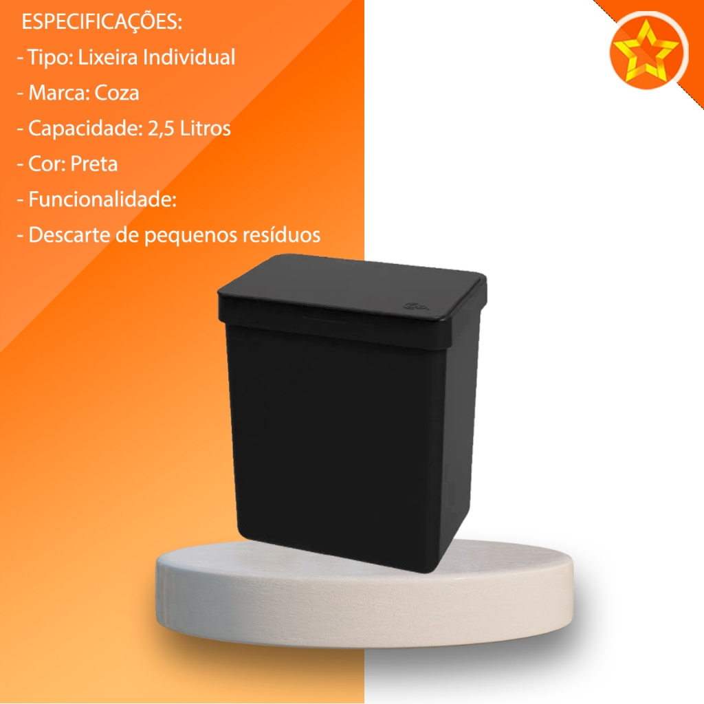 Descrição Resumida: A Lixeira Single de 2,5 Litros, na cor preta, da marca Coza, é uma solução compacta e funcional para o descarte de pequenos resíduos. Seu design discreto e prático a torna ideal para escritórios, banheiros ou espaços pequenos. Características: Tipo: Lixeira Individual Marca: Coza Capacidade: 2,5 Litros Cor: Preta Funcionalidade: Descarte de pequenos resíduos Informações Adicionais: Marca: Coza Capacidade: 2,5 Litros Cor: Preta Indicada para: Espaços pequenos, banheiros, escritórios Material: Polipropileno. Itens Inclusos: 01 Lixeira Single 2,5 Litros Preta.