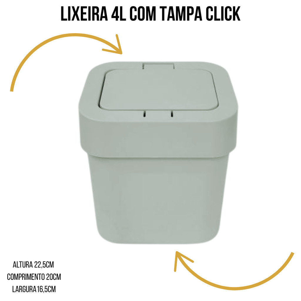 LIXEIRA 4L COM TAMPA CLICK – PRATICIDADE E ORGANIZAÇÃO PARA O SEU AMBIENTE! Ideal para quem busca funcionalidade e um toque de praticidade no dia a dia. A Lixeira 4L com Tampa Click é a solução perfeita para quem deseja manter a casa ou escritório sempre limpo e organizado. Com um design compacto e moderno, ela se adapta a qualquer ambiente e oferece total praticidade na hora de descartar resíduos. ????️ Capacidade ideal: 4 Litros de capacidade, perfeita para espaços pequenos, como banheiros, escritórios e cozinhas compactas. ???? Tampa Click: Sistema de fechamento com tampa click que garante a vedação e evita odores, mantendo o ambiente sempre fresco e livre de sujeira. ???? Durabilidade: Feita de material resistente e fácil de limpar, garantindo uso prolongado. Vantagens: Compacta e funcional para ambientes menores. Retém odores. Design moderno e discreto, combina com qualquer decoração. Fácil de manusear e limpar. Mantenha a organização sem abrir mão do estilo! ???? Adquira já a sua Lixeira 4L com Tampa Click e dê um toque de praticidade ao seu espaço!