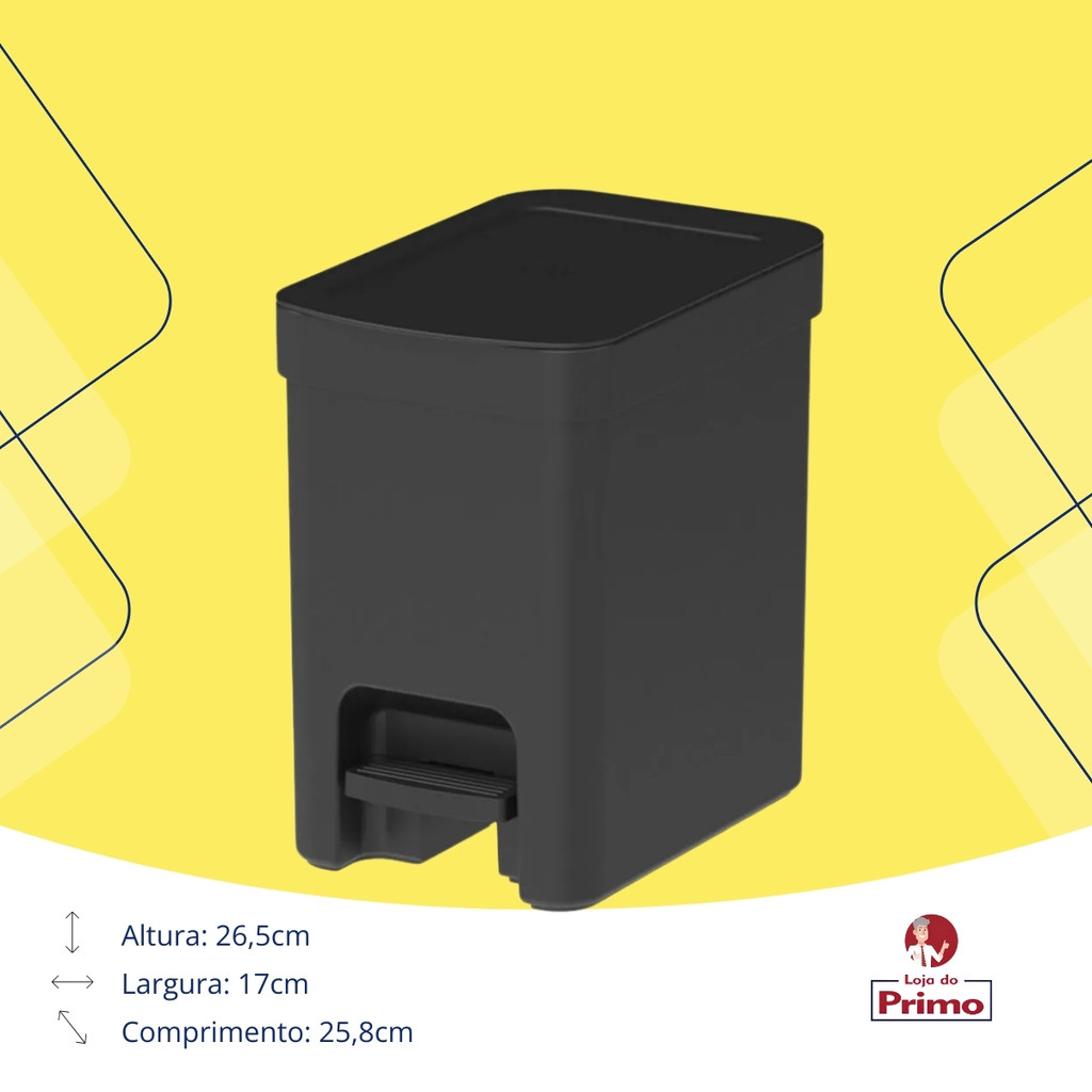 Mantenha seu ambiente limpo e organizado com a Lixeira com Pedal Trium Preta de 6L. Feita de polipropileno durável, esta lixeira é prática e elegante, perfeita para diversos espaços da sua casa ou escritório. Seu design moderno e funcional, combinado com a cor preta, adiciona um toque de sofisticação ao ambiente, enquanto o pedal facilita o uso sem a necessidade de tocar a tampa. Características: - Marca: OU Material: - Polipropileno Cor: Preta - Capacidade: 6 litros - Dimensões: 26,5 cm (altura) x 17 cm (largura) x 25,8 cm (profundidade) - Sistema de Abertura: Pedal Benefícios: - Praticidade: O sistema de pedal permite a abertura da lixeira sem o uso das mãos, promovendo higiene e facilidade de uso. - Durabilidade: Fabricada em polipropileno de alta qualidade, a lixeira é resistente e de longa durabilidade. - Compacta e Funcional: Com capacidade de 6 litros e dimensões compactas, ela se encaixa facilmente em qualquer espaço, ideal para cozinhas, banheiros e escritórios. - Fácil de Limpar: O material e o design da lixeira facilitam a limpeza, mantendo-a sempre em boas condições de uso. Uso Sugerido: - Cozinha: Perfeita para descartar resíduos de cozinha, mantendo o ambiente limpo e organizado. - Banheiro: Ideal para manter o banheiro organizado e higiênico, com fácil acesso ao descarte de lixo. - Escritório: Excelente para áreas de trabalho, proporcionando uma solução prática e discreta para o descarte de resíduos. Com a Lixeira com Pedal Trium Preta 6L, você combina praticidade e elegância, mantendo seus ambientes sempre limpos e organizados com um toque de estilo.