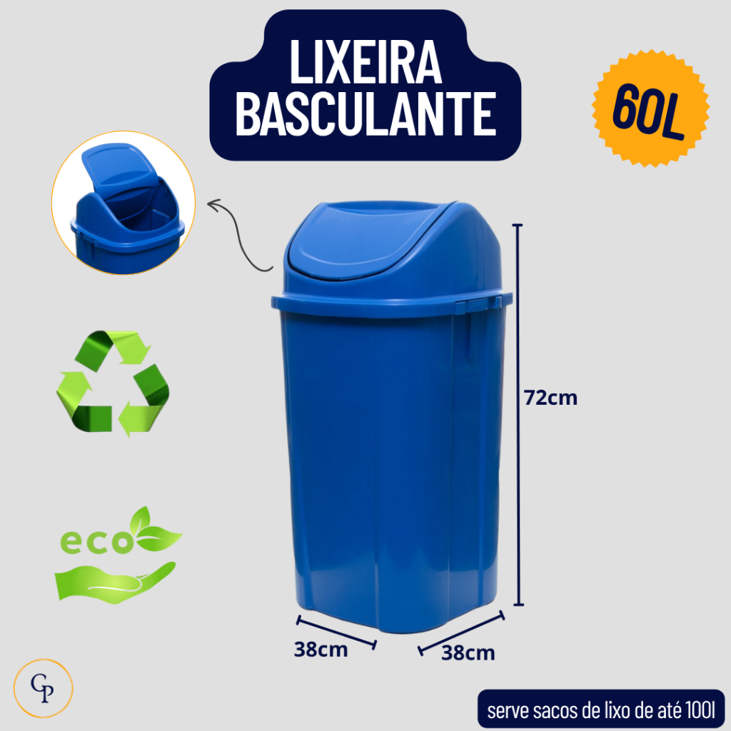 🗑️ Lixeira Basculante 60L – Alta Resistência, Multiuso e Ideal para Reciclagem ♻️ Durável, funcional e pronta para o uso diário em qualquer ambiente! Fabricada em Polietileno de Alta Densidade (PEAD) ou Polipropileno (PP), essa lixeira oferece excelente resistência a impactos, raios UV e lavagens constantes, sendo perfeita para locais com alta demanda. 🔧 Diferenciais que fazem a diferença: ✅ Super resistente: aguenta impactos e uso intenso sem trincar ou deformar ✅ Sistema Multi-Encaixe: permite empilhamento e economia de espaço ✅ Higienização fácil: manutenção simples e prática no dia a dia ✅ Fixação inteligente do saco: evita vazamentos e mantém tudo no lugar 🏢 Uso recomendado em diversos ambientes: ✔️ Coleta seletiva em condomínios, empresas e comércios ✔️ Armazenamento de resíduos industriais, hospitalares ou urbanos ✔️ Perfeita para shoppings, escolas, indústrias e áreas externas 📏 Especificações Técnicas: Altura: 72 cm Largura: 38 cm Profundidade: 38 cm Peso: 2,2 kg 🌟 Por que escolher esta lixeira? ✔️ Alta durabilidade e excelente custo-benefício ✔️ Empilhável para otimização de espaço ✔️ Produzida com materiais aprovados pela ANVISA, garantindo segurança e confiabilidade ✔️ Ideal para uso interno e externo – resistente ao tempo e ao desgaste diário 🚛 A escolha ideal para quem busca praticidade, organização e sustentabilidade!