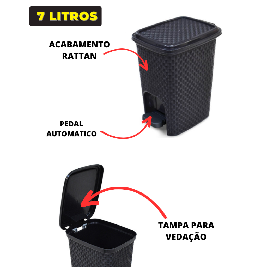 Lixeira 7 Litros Cesto de Lixo Com Tampa Pedal Para Cozinha Banheiro Escritório Rattan Reforçada Plástico Preta
