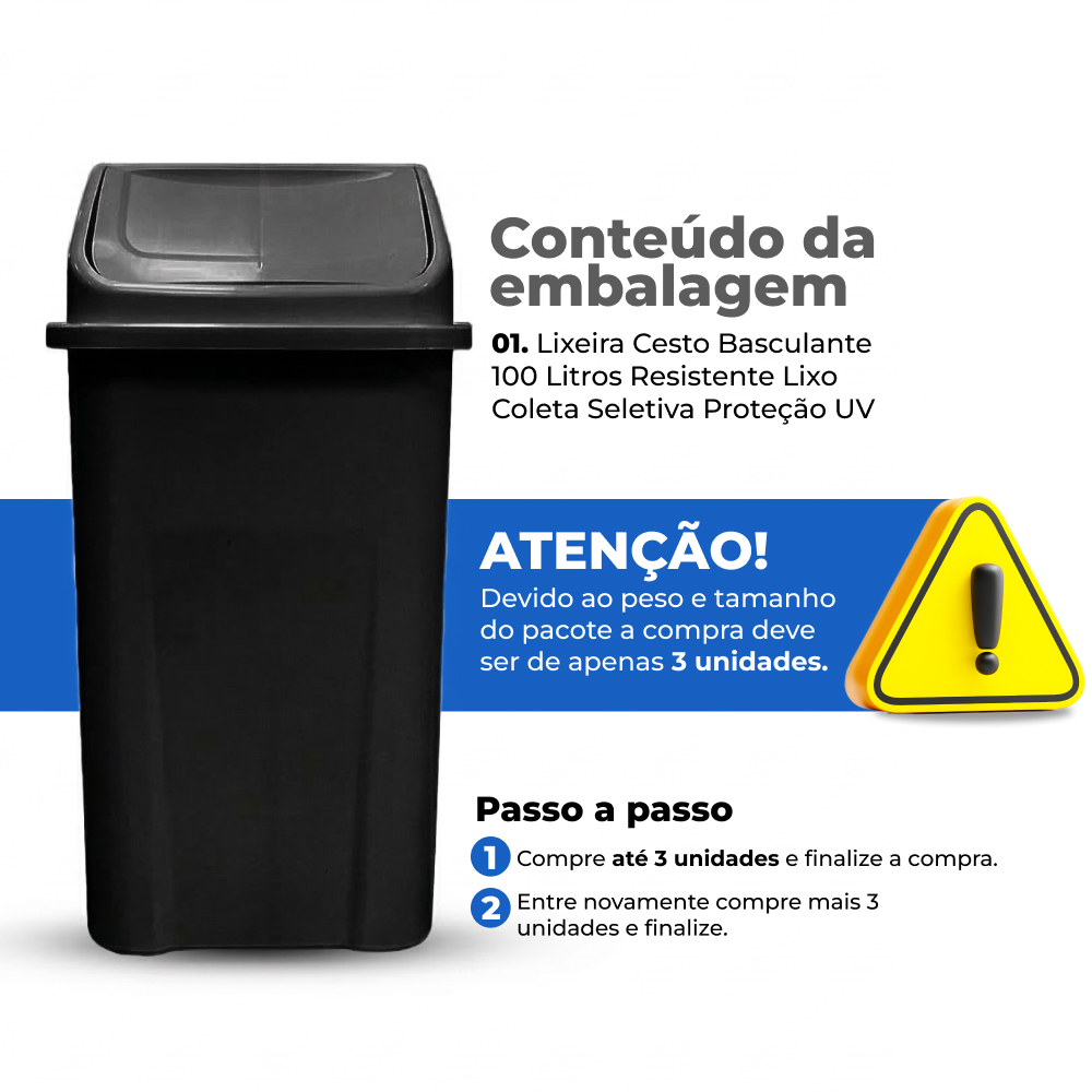 Lixeira Cesto Basculante 100 Litros Resistente Lixo Coleta Seletiva Proteção UV 🚨⚠️ COMPRE ATÉ 03 UNIDADES POR PEDIDO - CONSEGUIMOS ENVIAR ATÉ 03 LIXEIRAS POR COMPRA ⚠️🚨 Esta lixeira de 100L com tampa basculante "vai e vem" é a solução definitiva para uma coleta seletiva prática e higiênica em qualquer ambiente. Produzida com materiais de alta durabilidade, seu sistema de abertura facilita o descarte rápido e mantém a organização do espaço com total eficiência. Para garantir o melhor ajuste e o aproveitamento máximo do volume, recomenda-se a utilização de sacos de 200 litros. Diferenciais da nossa Basculante 100 Litros: - Porta Saco Integrado: Garante a fixação perfeita do saco de lixo e facilita a reposição. - Sistema Multiencaixe: Permite unir duas ou mais lixeiras pelos cantos sem ferramentas ou materiais extras. - Material Resistente: Alta durabilidade para uso interno ou externo. Benefícios para Coleta Seletiva: - Ajuda a reduzir a quantidade de resíduos que vão para os lixões e aterros sanitários 🌎 - Facilita a reciclagem e reutilização de materiais ♻️ - Contribui para a preservação do meio ambiente e a saúde pública 🌟 Para melhor utilização: Use Sacos de 200 LITROS. 🚨⚠️ COMPRE ATÉ 03 UNIDADES POR PEDIDO - CONSEGUIMOS ENVIAR ATÉ 03 LIXEIRAS POR COMPRA ⚠️🚨 Medidas Aproximadas: - Comprimento: 46,5 C - Largura: 44,5 - Altura: 84,5 - Peso: 3,35 KG Cores Disponíveis: - Amarelo 💛 - Metal em geral - Azul 📘 - Papel; papelão - Branco ⚪️ - Resíduos ambulatoriais e de serviços de saúde - Cinza ⬜️ - Resíduo geral não reciclável ou misto, ou contaminado não passível de separação - Laranja 🧡 - Resíduos perigosos - Marrom 🍃 - Resíduos orgânicos - Preto ⚫️ - Madeira - Verde 🌿 - Vidro - Vermelho 🔥 - Plástico Conteúdo da Embalagem: 01. Lixeira Cesto Basculante 100 Litros Resistente Lixo Coleta Seletiva Proteção UV Compre com Confiança! 💯
