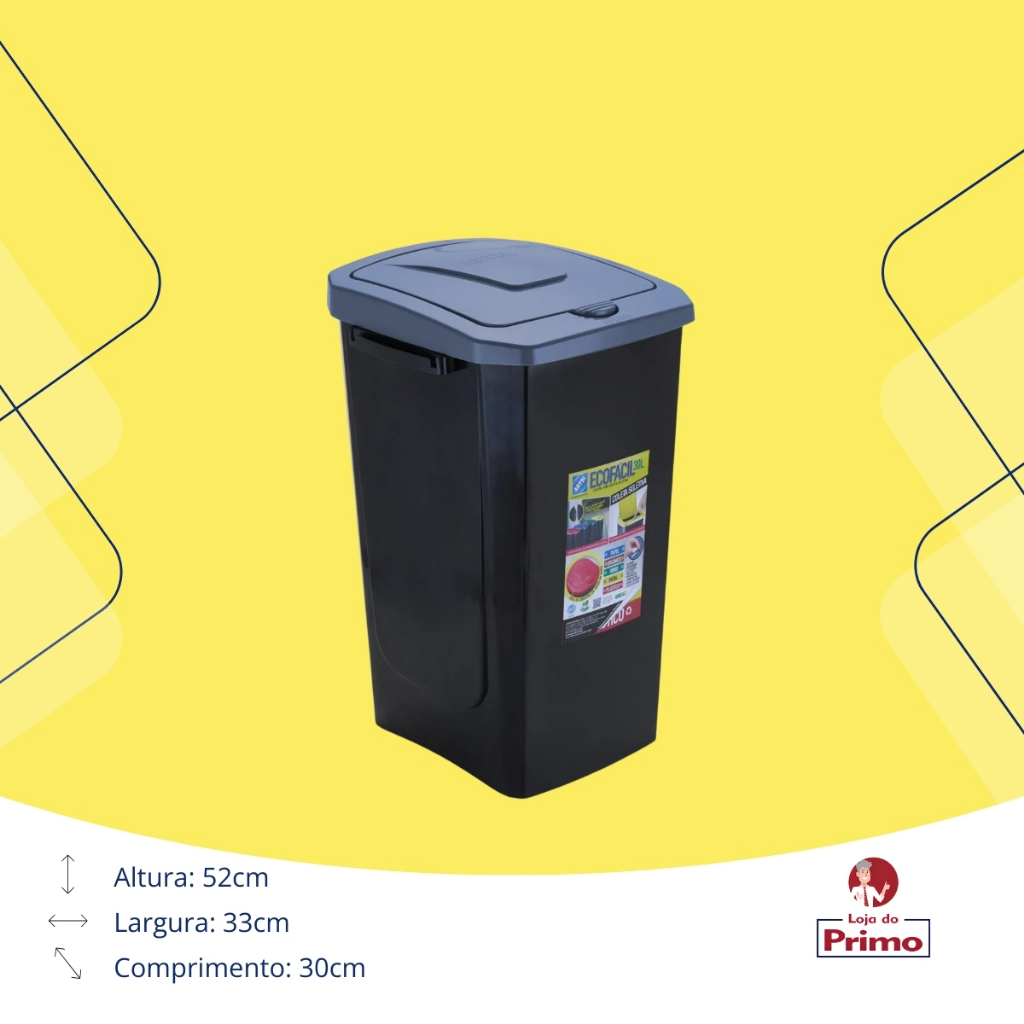 Lixeira Coleta Seletiva Ecofácil 30 Litros Preta – Arthi Organize sua casa, escritório ou ambiente comercial com praticidade e consciência ambiental usando a Lixeira Coleta Seletiva Ecofácil da Arthi. Com capacidade para 30 litros, essa lixeira é ideal para separar resíduos recicláveis ou orgânicos de maneira funcional e elegante. Características principais: Design funcional e moderno: Com formato retangular e acabamento na cor preta, combina com diversos ambientes sem comprometer a estética. Capacidade ideal: Seus 30 litros oferecem o equilíbrio perfeito entre tamanho compacto e boa capacidade de armazenamento, ideal para uso doméstico ou em pequenas empresas. Estrutura resistente: Fabricada em material plástico de alta qualidade, garante durabilidade, fácil higienização e resistência ao uso diário. Tampa articulada: Facilita o descarte dos resíduos e evita a propagação de odores. Compatível com sacos de lixo padrão: Pode ser usada com sacos de até 50 litros, proporcionando praticidade na troca e descarte. Indicada para coleta seletiva: Ideal para organizar a separação de lixo reciclável, ajudando no cuidado com o meio ambiente. Dimensões do produto: Altura: 52 cm Largura: 33 cm Comprimento: 30 cm A Lixeira Ecofácil 30L da Arthi é a escolha certa para quem busca aliar sustentabilidade, organização e praticidade no dia a dia.