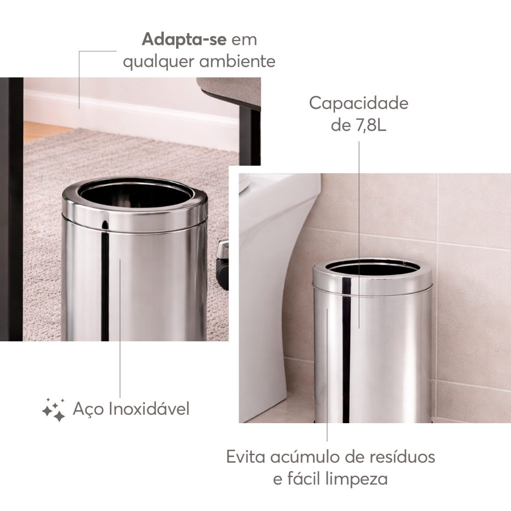 Seja Bem-Vindo(a) à Mimorada! Ambientes residenciais e comerciais precisam de recipientes para depositar o lixo e, normalmente, estes objetos são super manuseados e utlizados. Por isso, a Decorline lançou uma linha de lixeiras completa: discretas mas muito elegantes, resistentes, fáceis de limpar e manusear. Seu corpo em aço inox com acabamento alto brilho não apresenta porosidades, o que evita o acúmulo de resíduos e facilita a limpeza. O aro facilita o manuseio da peça e o fundo plástico protege a lixeira e garante uma longa vida útil ao produto. A lixeira Decorline com aro está disponível em oito tamanhos e é perfeita para os mais diversos ambientes da sua casa ou empresa: 3,2L (ø 15,5cmx17cm), 5,4L (18,5cmx20cm), 7,8L (18,5cmx29cm), 21,2L (25cmx46cm), 28,17L (25cmx60cm), 40,5L (30cmx60cm), 47L (30cmx70cm) e 64L (35cmx70cm).
