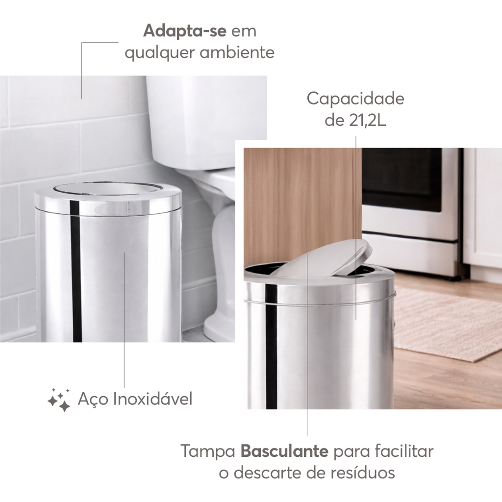 Seja Bem-Vindo(a) à Mimorada! Ambientes residenciais e comerciais precisam de recipientes para depositar os resíduos e, normalmente, estes objetos são super manuseados e utilizados. Por isso, a Decorline lançou uma linha de lixeiras completa: discretas e muito elegantes, resistentes, fáceis de limpar e manusear. Seu corpo em aço inox com acabamento alto brilho não apresenta porosidades, o que evita o acúmulo de resíduos e facilita a limpeza. A tampa basculante é super fácil de usar e resistente e o fundo plástico protege a lixeira e garante longa vida útil ao produto. A lixeira Decorline com tampa basculante está disponível em oito tamanhos e é perfeita para os mais diversos ambientes da sua casa ou empresa: 3,2L (ø 15,5cmx17cm), 5,4L (18,5cmx20cm), 7,8L (18,5cmx29cm), 21,2L (25cmx46cm), 28,17L (25cmx60cm), 40,5L (30cmx60cm), 47L (30cmx70cm) e 64L (35cmx70cm). Material: Aço Inox