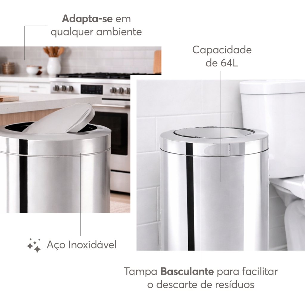 Seja Bem-Vindo(a) à Mimorada! Lixeira Com Tampa Basculante Brinox Decorline 64 Litros Aço Inox Ambientes residenciais e comerciais precisam de recipientes para depositar os resíduos e, normalmente, estes objetos são super manuseados e utilizados. Por isso, a Decorline lançou uma linha de lixeiras completa: discretas e muito elegantes, resistentes, fáceis de limpar e manusear. Seu corpo em aço inox com acabamento alto brilho não apresenta porosidades, o que evita o acúmulo de resíduos e facilita a limpeza. A tampa basculante é super fácil de usar e resistente e o fundo plástico protege a lixeira e garante longa vida útil ao produto. A lixeira Decorline com tampa basculante está disponível em oito tamanhos e é perfeita para os mais diversos ambientes da sua casa ou empresa: 3,2L (ø 15,5cmx17cm), 5,4L (18,5cmx20cm), 7,8L (18,5cmx29cm), 21,2L (25cmx46cm), 28,17L (25cmx60cm), 40,5L (30cmx60cm), 47L (30cmx70cm) e 64L (35cmx70cm). Material: Aço Inox