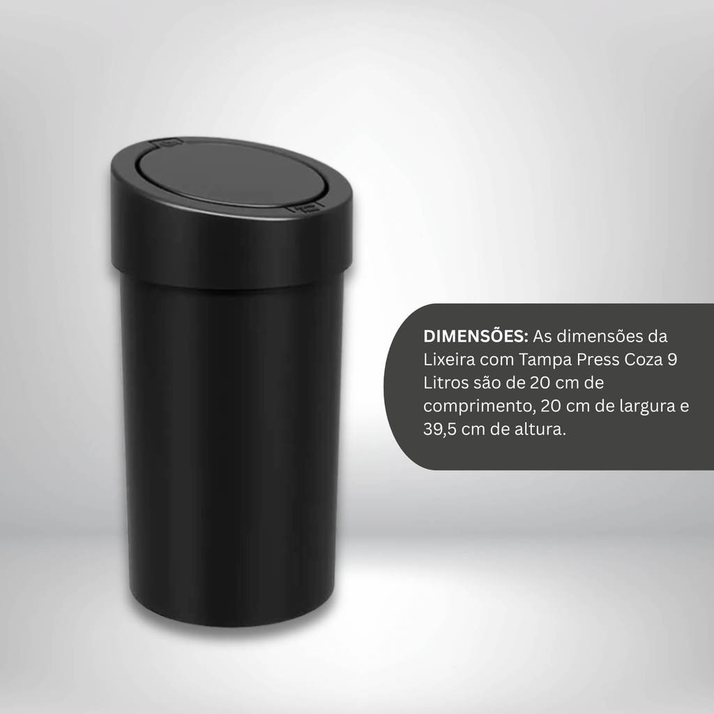 Conheça a Lixeira com Tampa Press Coza 9 Litros Preto, um equilíbrio perfeito entre funcionalidade, estilo e praticidade, projetado para se encaixar perfeitamente em diversos ambientes da sua casa ou escritório. DIFERENCIAIS: Com o inconfundível design exclusivo da Coza, esta Lixeira com Tampa Press é a opção ideal para todos os cômodos da sua casa. Seu visual moderno e versátil permite que ela se integre harmoniosamente a qualquer decoração. A característica inovadora desta lixeira reside no sistema de acionamento da tampa por meio de um click. Esse mecanismo libera suas mãos, garantindo higiene e segurança ao descartar seus resíduos. Com uma capacidade de 9 litros, suas dimensões de 20 cm de diâmetro por 39,5 cm de altura a tornam compacta e ao mesmo tempo espaçosa o suficiente para acomodar os resíduos do seu dia a dia. O tamanho alto e compacto desta Lixeira a torna perfeita para diversos ambientes. Seja no escritório, no banheiro ou na cozinha, ela se adapta com facilidade, garantindo uma solução prática e funcional. A Lixeira Com Tampa Press Coza 9 Litros com abertura tipo Click é uma das primeiras lixeiras no Brasil com este sistema de abertura e um produto ícone da marca Coza, premiada no Prêmio Bornancini de Design. MATERIAL: A Lixeira com Tampa Press Coza 9 Litros é fabricada em Poliestireno (PP) alta qualidade, sendo resistente e durável, garantindo sua eficácia por muito tempo. Tenha a certeza de estar adquirindo um produto que proporcionará resultados consistentes. DIMENSÕES: As dimensões da Lixeira com Tampa Press Coza 9 Litros são de 20 cm de comprimento, 20 cm de largura e 39,5 cm de altura. INSTRUÇÃO DE USO E LIMPEZA: Para limpeza e manutenção, basta utilizar um pano macio e umedecido (ou o lado macio da esponja) com água e sabão neutro. Evite o uso de materiais abrasivos que possam danificar a superfície do produto. INFORMAÇÕES ADICIONAIS: Para otimizar o uso da Lixeira com Tampa Press, recomendamos o uso de sacolas plásticas de alta resistência. Além disso, o aro interno esconde o saco plástico, proporcionando uma estética mais limpa e elegante para o seu ambiente. A Coza é sinônimo de qualidade e durabilidade. A Lixeira com Tampa Press Coza 9 Litros é construída para resistir ao uso contínuo, mantendo seus objetos pessoais protegidos e organizados por muito tempo. A Lixeira com Tampa Press Coza 9 Litros reúne todas as características que você precisa em uma lixeira: estilo, praticidade, higiene e inovação. Escolha a qualidade da Coza para tornar seus espaços mais organizados e funcionais. Características: - Marca:Brinox - Modelo:10909/0008 *Imagens Meramente Ilustrativas* Conteúdo da Embalagem: - 01x Lixeira com Tampa Press Coza 9 Litros Preto