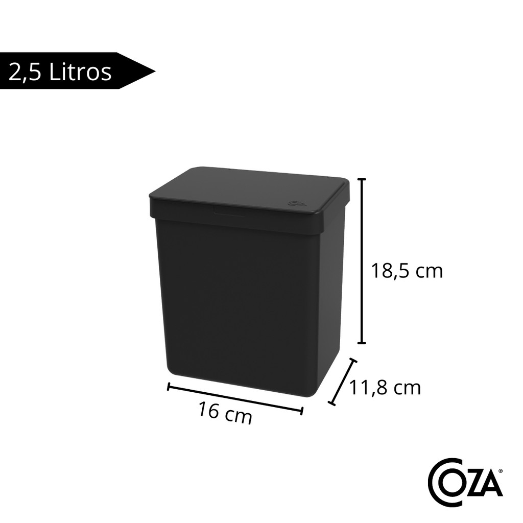 A Lixeira Single com Tampa 2,5L da Coza deixará sua cozinha linda. Na hora de organizar a cozinha, a lixeira sobre a pia traz praticidade, além de contribuir para a decoração. Seu sistema de abertura é desenhada para esconder o saco de lixo; Sua capacidade de 2,5L foi desenvolvida justamente para torná-la compacta e se adequar em qualquer tamanho de bancada. Design inteligente e cores diferenciadas. MAIS INFORMAÇÕES: Altura: 18,5 cm Largura: 16,4 cm Profundidade: 11,8 cm Material/Composição: Polipropileno ----------------------------------------------------------------------------------------------------------------------------- PERGUNTAS FREQUENTES: 1 - Quais são as cores disponíveis: Temos as cores: Preto, Vermelho, Branco, Amarelo, Azul, Cinza Porém a pronta entrega depende da disponibilidade de cada produto. 2 - A tampa é de click? Não, a abertura da tampa é manual 3 - Qual a capacidade da lixeira? 2,5 Litros 4 - Tem outros itens dessa linha para compor minha cozinha? Sim, nós temos a linha completa: Escorredor de louça, escorredor de talheres, dispenser de detergente, organizador de pia, grade de pia, e muito mais. Basta clicar em: Mais anúncios desse vendedor. 5 - Posso utilizar a lixeira no banheiro? Sim, você pode. Porém indicamos as de 4L para cima para banheiros, cheque nossos outros modelos. ------------------------------------------------------------------------------------------------------------------------------- Sobre Nós Cantinho Estiloso é uma loja de decoração e utilidades domésticas que surgiu com o intuito de levar estilo e sofisticação a todas as casas do Brasil com um preço acessível. Nosso compromisso é atender nossos clientes de forma transparente e honesta em tudo o que fazemos. Trabalhamos apenas com empresas sérias e comprometidas em entregar o melhor produto. Nós acreditamos que Cantinho Estiloso é aquele em que a gente se sente bem, seja na cozinha, na sala, quarto, banheiro, não importa, são os detalhes que fazem a diferença. Todos nossos produtos nacionais são direto da fábrica e os importados são adquiridos com importadores oficiais. *Todos os produtos são Novos e com Nota Fiscal* Agradecemos a preferência! Cantinho Estiloso :)
