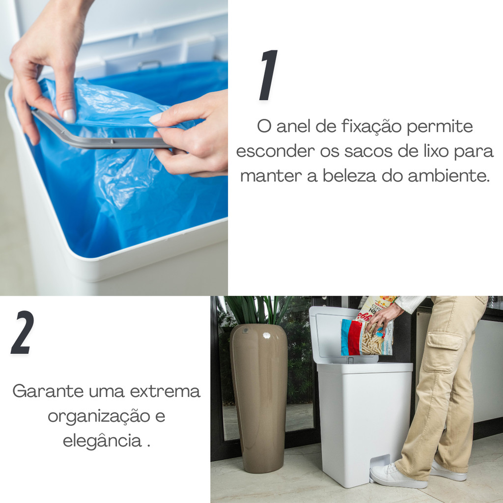 Lixeira Dupla com Pedal 50 L – Linha Trium / OU Descubra o equilíbrio perfeito entre sofisticação e praticidade para sua casa com a Lixeira Trium 50 L, da OU. Ideal para quem busca organização funcional com um toque de elegância. -----ENVIO IMEDIATO ---- Lixeira com Pedal 50 L – Linha Trium / OU Transforme sua rotina com organização, praticidade e estilo. Por que você vai se apaixonar: • Design Minimalista com acabamento fosco — harmoniza com qualquer decoração moderna. • Bag invisível? Sim! Anel interno mantém o saco longe da vista. • Dupla abertura inteligente: acione com pedal ou com a mão; o pedal fecha automaticamente. • Material resistente em PP — robusta e duradoura para o dia a dia. Cuidados simples = produto valorizado: Use apenas sabão neutro e esponja macia. Evite abrasivos. Garantia de 90 dias. Linha Trium: a combinação perfeita de forma, função e design. Descubra a elegância organizada! O que torna esse produto especial? Design minimalista e acabamento fosco, que se integra com charme a qualquer ambiente moderno. - Anel interno para esconder o saco de lixo, mantendo o ambiente limpo e visualmente agradável . -Abertura prática: funciona tanto com pedal quanto manualmente; o pedal faz a tampa fechar automaticamente, evitando contato desnecessário . - Material durável: produzida em polipropileno de alta qualidade, garante estabilidade e resistência no dia a dia. Dimensões ideais: 56 cm de altura, 40 cm de largura e 30,8 cm de profundidade; capacidade generosa de 50 L . Linha Trium: reúne funcionalidade inteligente, estética refinada e versatilidade — perfeita para cozinhas, lavanderias e outros ambientes