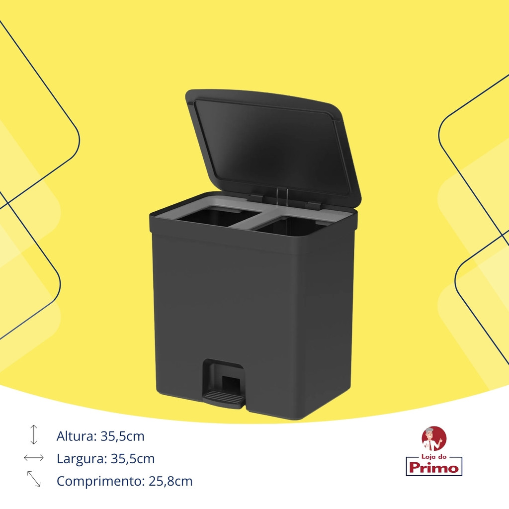 Lixeira Dupla com Pedal 20L – Preta A Lixeira Dupla com Pedal é a escolha ideal para quem busca praticidade, higiene e organização em diversos ambientes, como cozinha, banheiro, escritório e áreas comerciais. Com design moderno na cor Preta, ela oferece funcionalidade e discrição, combinando perfeitamente com qualquer decoração. Diferenciais do Produto: ✅ Capacidade de 20 litros – ideal para separar resíduos de forma eficiente ✅ Sistema de pedal – proporciona maior higiene ao evitar contato direto com a tampa ✅ Esconde saco – mantém o ambiente mais organizado e esteticamente agradável ✅ Dimensões bem proporcionadas: - Altura: 35,5 cm - Largura: 35,5 cm - Comprimento: 25,8 cm ✅ Material resistente: fabricada em PP (Polipropileno), garantindo durabilidade e facilidade na limpeza ✅ Design funcional e compacto, ideal para diferentes espaços O sistema esconde saco proporciona um acabamento mais limpo e sofisticado, enquanto o pedal robusto facilita a abertura da tampa sem a necessidade de usar as mãos, tornando seu uso mais higiênico e prático no dia a dia. Perfeita para quem deseja uma lixeira moderna, funcional e eficiente para diferentes ambientes!