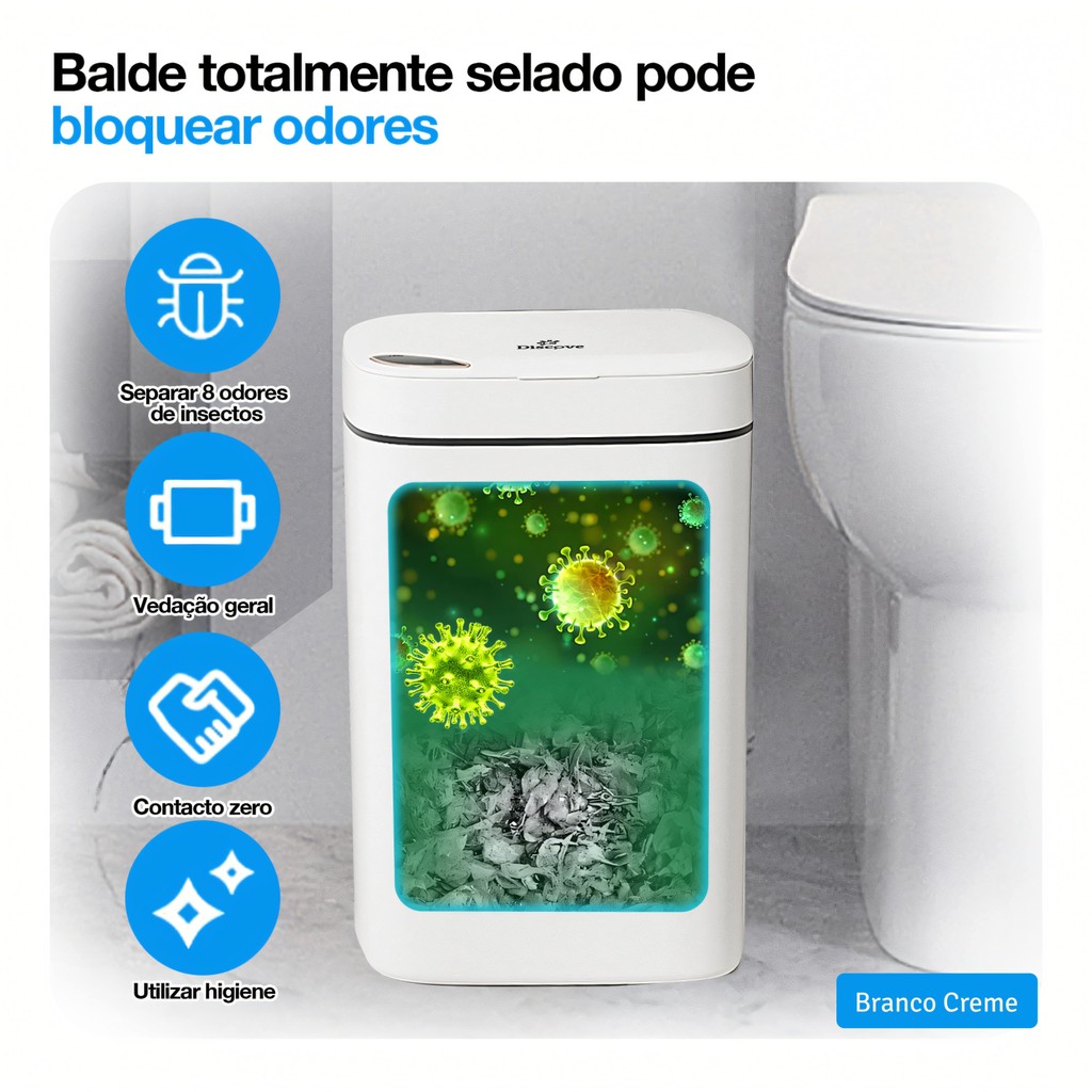 ATENÇÃO: O produto funciona via CARREGAMENTO USB com o cabo que o acompanha, ele NÃO FUNCIONA A PILHAS. O compartimento que aparenta ser para uso de pilhas está inutilizado nesse modelo e não necessita ser colocado nenhum tipo de bateria ou peça adicional no mesmo para conseguir fazer a carga. Transforme Seu Dia a Dia com a Lixeira Inteligente Discove! Você adora inovação e praticidade? Então, prepare-se para se apaixonar pela nossa Lixeira Inteligente! Com um design moderno e uma tecnologia que facilita a sua rotina, ela é perfeita para quem busca mais conveniência no dia a dia. Benefícios Incríveis: - Facilidade no Dia a Dia: Abra e feche a tampa sem precisar usar as mãos! - Tecnologia de Detecção: Coloque a mão ou o joelho a 10-30 cm da área de detecção e a tampa se abre magicamente! - Função de Toque: Um leve chute ou toque é tudo o que precisa para abrir a tampa. - Trava Inteligente: Mantenha a tampa aberta com um simples toque de botão. - Carregamento Simples: Quando a bateria estiver baixa, a luz vermelha indica que é hora de carregar. Simples assim! Especificações modelo CS003 Branco Creme14L: - Capacidade: 14L - Dimensão: 23x20x31,5CM - Material: ABS+PP Polypropylene + Componentes Eletrônicos de ABS - Tensão de Carregamento: 5V - Potência: 3-4W - Aplicações: Banheiro, Quarto, Cozinha, Sala, Escritório e Etc. - Cor: Branco Creme Especificações modelo CS004 Branco Creme 16L: - Capacidade: 16L - Dimensão: 20x23x36CM - Material: ABS+PP Polypropylene + Componentes Eletrônicos de ABS - Tensão de Carregamento: 5V - Potência: 3-4W - Aplicações: Banheiro, Quarto, Cozinha, Sala, Escritório e Etc. - Cor: Branco Creme Especificações do modelo CS005 Branco Creme14L: - Capacidade: 14L - Dimensão: 23x20x31,5CM - Material: ABS+PP Polypropylene + Componentes Eletrônicos de ABS - Tensão de Carregamento: 5V - Potência: 3-4W - Aplicações: Banheiro, Quarto, Cozinha, Sala, Escritório e Etc. - Cor: Branco Creme Especificações do modelo CS036 Branco Creme ou Preto: - Capacidade: 12L - Dimensão: 28 x 21 x 18 CM - Material: ABS+PP Polypropylene + Componentes Eletrônicos de ABS - Tensão de Carregamento: 5V - Potência: 5 W - Aplicações: Banheiro, Quarto, Cozinha, Sala, Escritório e Etc. - Cor: Branco Creme ou Preto ( Escolha no anúncio ) Instruções de Uso: 1. Ligar/Desligar: Pressione o botão por 3 segundos para ligar e 4 segundos para desligar. 2. Primeiro Uso: Carregue completamente antes de usar. A luz vermelha indica quando está carregando e a luz azul indica que está totalmente carregado. Funções Especiais: - Detecção da Tampa: Aproxime-se 10-30 cm da área de detecção. - Função de Toque: Um chute ou toque abre a tampa automaticamente. - Função de Trava: Passe a mão por cima para abrir a tampa e aperte o botão de ligar para manter ela aberta. (Aperte novamente para desativar essa opção) Precauções: - Não feche a tampa manualmente para evitar danos internos. - Não enxágue a tampa com água. Itens: 1x Cesta 1x Tampa automática 1x Cabo para carregamento 1x Suporte para saco de lixo 1x Anel de pressão para saco de lixo