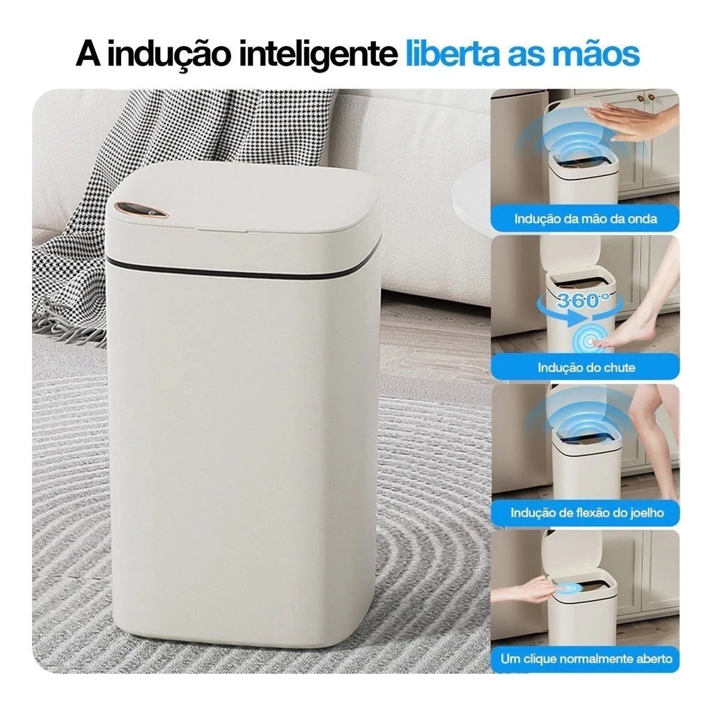O produto funciona via CARREGAMENTO USB com o cabo que o acompanha, ele NÃO FUNCIONA A PILHAS. O compartimento que aparenta ser para uso de pilhas está inutilizado nesse modelo e não necessita ser colocado nenhum tipo de bateria ou peça adicional no mesmo para conseguir fazer a carga. Transforme Seu Dia a Dia com a Lixeira Inteligente Discove! Você adora inovação e praticidade? Então, prepare-se para se apaixonar pela nossa Lixeira Inteligente! Com um design moderno e uma tecnologia que facilita a sua rotina, ela é perfeita para quem busca mais conveniência no dia a dia. Benefícios Incríveis: - Facilidade no Dia a Dia: Abra e feche a tampa sem precisar usar as mãos! - Tecnologia de Detecção: Coloque a mão ou o joelho a 10-30 cm da área de detecção e a tampa se abre magicamente! - Função de Toque: Um leve chute ou toque é tudo o que precisa para abrir a tampa. - Trava Inteligente: Mantenha a tampa aberta com um simples toque de botão. - Carregamento Simples: Quando a bateria estiver baixa, a luz vermelha indica que é hora de carregar. Simples assim! Especificações modelo CS003 Branco Creme14L: - Capacidade: 14L - Dimensão: 23x20x31,5CM - Material: ABS+PP Polypropylene + Componentes Eletrônicos de ABS - Tensão de Carregamento: 5V - Potência: 3-4W - Aplicações: Banheiro, Quarto, Cozinha, Sala, Escritório e Etc. - Cor: Branco Creme Especificações modelo CS004 Branco Creme 16L: - Capacidade: 16L - Dimensão: 20x23x36CM - Material: ABS+PP Polypropylene + Componentes Eletrônicos de ABS - Tensão de Carregamento: 5V - Potência: 3-4W - Aplicações: Banheiro, Quarto, Cozinha, Sala, Escritório e Etc. - Cor: Branco Creme Especificações do modelo CS036 Branco Creme ou Preto: - Capacidade: 12L - Dimensão: 28 x 21 x 18 CM - Material: ABS+PP Polypropylene + Componentes Eletrônicos de ABS - Tensão de Carregamento: 5V - Potência: 5 W - Aplicações: Banheiro, Quarto, Cozinha, Sala, Escritório e Etc. - Cor: Branco Creme ou Preto ( Escolha no anúncio )