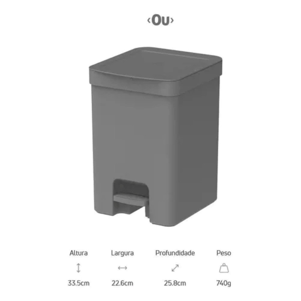 Lixeira com Pedal Trium 12 Litros Mantenha seu ambiente sempre limpo, organizado e elegante com a Lixeira com Pedal Trium 12 Litros. Desenvolvida com design contemporâneo, moderno e minimalista, ela combina praticidade e sofisticação, sendo perfeita para uso em cozinhas, banheiros, escritórios ou áreas de serviço. Sua capacidade de 12 litros é ideal para o dia a dia, e o sistema de pedal permite o uso sem contato manual, garantindo mais higiene e comodidade. A tampa especial foi projetada para esconder o saco de lixo, mantendo o visual limpo e discreto, enquanto o anel de fixação interno evita que o saquinho se solte. Feita em polipropileno (PP) de alta qualidade, possui acabamento fosco, o que agrega modernidade e resistência ao produto. É leve, prática de transportar e fácil de higienizar, tornando-se uma excelente escolha para quem busca funcionalidade com estilo. INFORMAÇÕES TÉCNICAS Altura: 33,5 cm Largura: 22,6 cm Profundidade: 25,8 cm Material: Polipropileno (PP) Capacidade: 12 Litros Linha: Trium CUIDADOS Limpe com sabão neutro e esponja macia, evitando o uso de produtos abrasivos para preservar o acabamento.