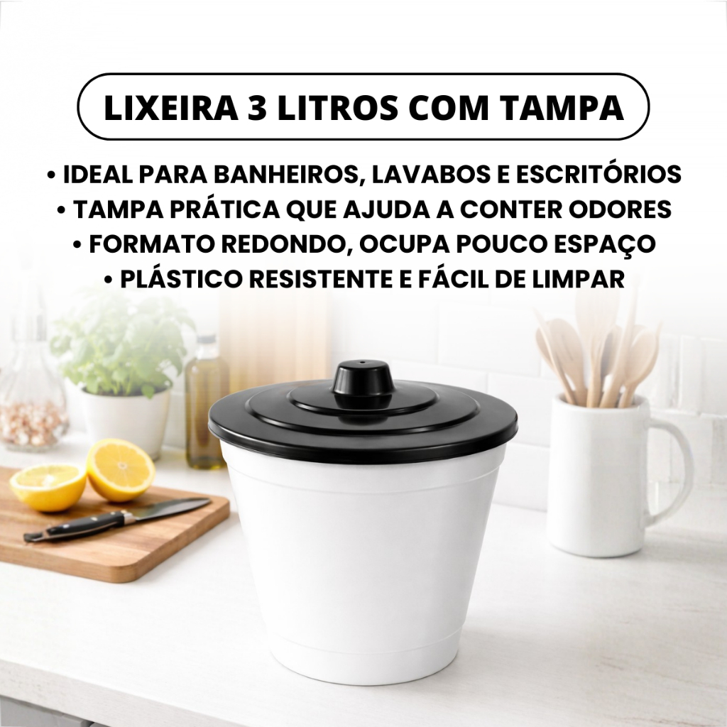 | Lixeira Plástica 3L Com Tampa Resistente P/ Escritório Cozinha Pia ... este produto | R$ 13,90 | 30% | 5.0/5 | 3 |