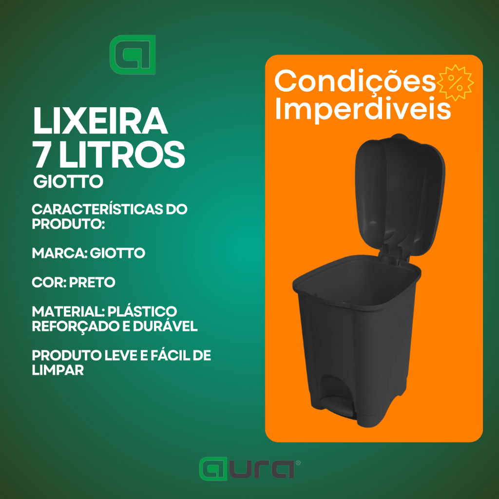 Lixeira de plástico preto Giotto Caracteristicas do produto Materiais da estrutura: Plástico Material da tampa: Plástico Tipos de aberturas: Pedal Lugar de colocação: chão É de embutir: Não Capacidade: 7 Litros