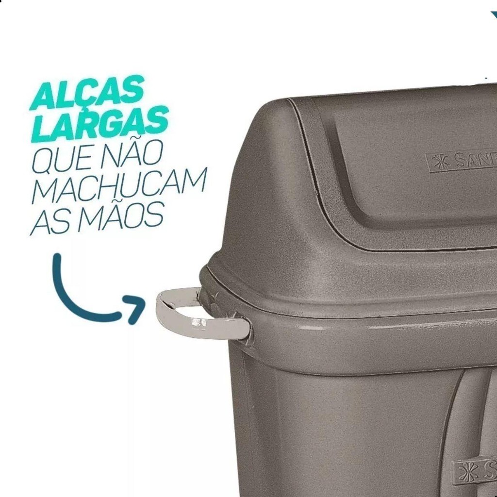 Lixeira com design diferenciado e ultra resistente: pode utilizada em qualquer ambiente e possui alças largas, que não machucam as mãos nas tarefas do dia a dia. É mais conforto para você e mais higiene e organização para a sua casa ou escritório. • 30 litros. • Tampa basculante: impede o contato direto com o lixo. • Alças largas: não machucam as mãos. • 3 vezes mais resistente a impacto, rachaduras e quebras. Ótima para pisos abrasivos. Dimensões: 58 x 26 x 36 cm (AxLxC)