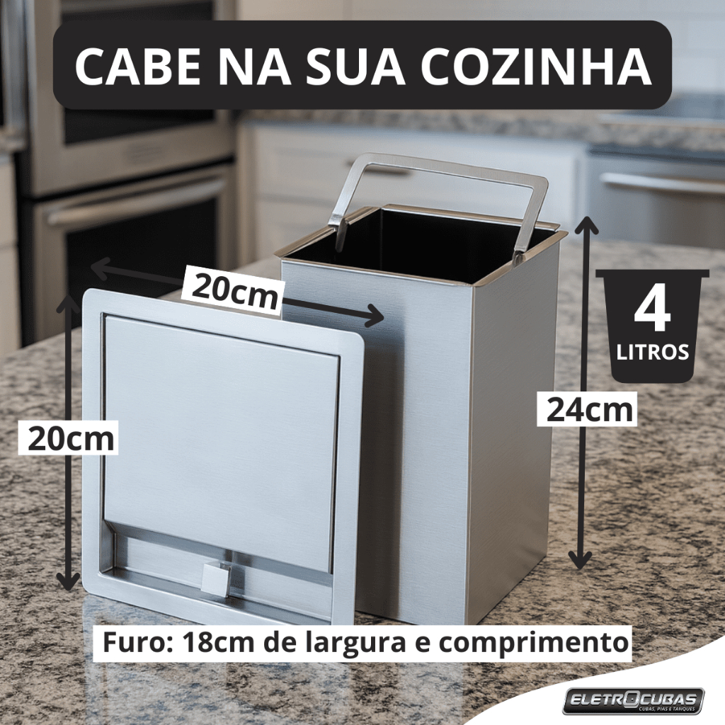 A Lixeira Quadrada de Inox 304 de Embutir de 4L da Eletrocubas é a solução ideal para quem busca praticidade e elegância na organização de espaços. Com um design compacto e sofisticado, ela se adapta perfeitamente a bancadas de cozinha, banheiro, áreas de serviço e gourmet, oferecendo uma capacidade de 4 litros. Fabricada em aço inoxidável 304, este modelo é resistente à corrosão, garantindo durabilidade e fácil manutenção. Suas dimensões de 20 cm de largura e comprimento, e 24 cm de altura, permitem que seja embutida de forma discreta, mantendo a estética do ambiente. A tampa em aço inoxidável proporciona um fechamento seguro e higiênico, ideal para o descarte de resíduos. Com um peso de apenas 1 kg, é fácil de manusear e instalar, tornando-se uma adição prática e funcional à sua casa. Características técnicas: - Marca: Eletrocubas - Material: Aço inoxidável 304 - Material da Tampa: Aço Inoxidável 304 - Material do Cesto: Aço Inoxidável 304 - Acabamento: Escovado - Instalação: Embutir - Medidas : 20cm de largura e comprimento x 24cm de altura - Furo para bancada: 18cm de largura e comprimento - Indicação de uso: Cozinha, Área Gourmet, Área de Serviço, Banheiro - Recomendada para Áreas Litorâneas: Sim - Garantia de Fábrica: 10 anos Vantagens: - Resistente à Corrosão e Ferrugem - Fácil Higienização e Manutenção - Alta Durabilidade - Custo-benefício - Fácil Instalação - Acabamento e Design Sofisticado - Pode ser usado em Áreas Litorâneas Itens Inclusos: - 1 Lixeira Quadrada de Inox 304 de Embutir de 4L