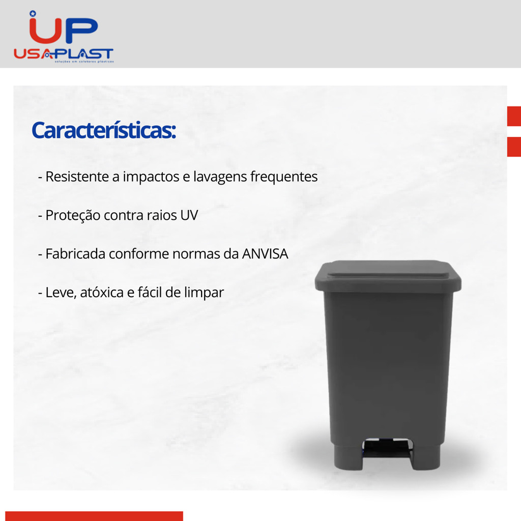 Lixeira Retangular Com Pedal 50 Litros ..................................................................................................................................... INFORMAÇÕES SOBRE O PRODUTO ..................................................................................................................................... A Lixeira Com Pedal 50 Litros, em PEAD ou PP, é injetada com alta tecnologia, seguindo normas da ANVISA e com proteção UV. Resistente e durável, proporciona higiene com acionamento do pedal, evitando contato direto com o lixo ..................................................................................................................................... ESPECIFICAÇÕES DO PRODUTO ..................................................................................................................................... Haste externa evita acúmulo de resíduos, com articulação para segurar saco de lixo. Leve, atóxica e vedada quando fechada, é disponível em diversas cores, indicada para coleta seletiva, lanchonetes, restaurantes, shoppings, condomínios, escolas, universidades, estabelecimentos comerciais e industriais. Opção de haste de plástico ou metal, resistente a impactos e lavagens para uso profissional. -MODELO: Lixeira USA 50L Com Pedal -LARGURA: 330mm -ALTURA: 720mm -COMPRIMENTO: 440mm -PESO: 3.3kg ..................................................................................................................................... DÚVIDAS FREQUENTES ..................................................................................................................................... Pergunta: Como é embalado o produto? Resposta: Todos os nossos produtos vendidos são embalados em caixas lacradas ou plástico stretch. Em respeito ao meio ambiente 90% das caixas são reutilizadas. Pergunta: Quem faz a entrega? Resposta: A entrega é terceirizada, feita via CORREIOS ou TRANSPORTADORA. Pergunta: O envio é feito em quantos dias? Resposta: Nós enviamos o seu pedido no prazo máximo de 24 horas após a confirmação de sua compra, sendo um dos envios mais rápidos da plataforma. Pergunta: Os produtos são novos ou usados? Resposta: Todos os produtos que trabalhamos são novos e com qualidade garantida. .....................................................................................................................................
