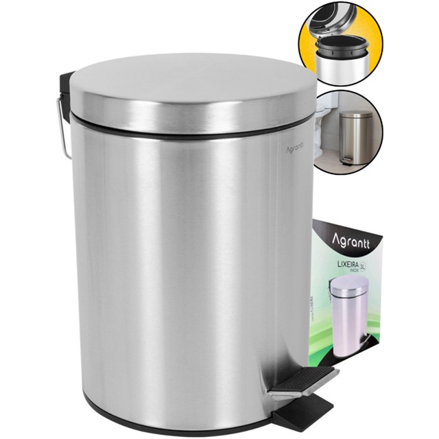 Lixo Lixeira 3 Litros Agrantt Inox Escovado Pedal Balde Removível Lavabo Banheiro Casa Escritório