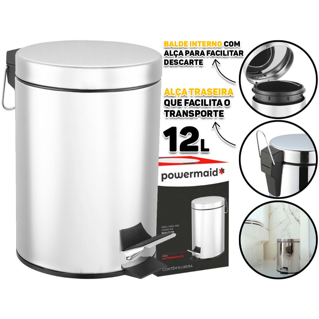 Lixeira Redonda Inox Powermaid Apresentamos a Lixeira Inox Powermaid, a combinação perfeita de estilo e funcionalidade para o seu lar! Com ela, você resolve o problema de descarte de resíduos de forma higiênica e adiciona um toque de elegância que transformará o seu ambiente. Características: > Alça para fácil transporte; > Possui pedal antiderrapante; > Ideal para ser usada em qualquer superfície; > Balde interno removível e com alça, que facilita o descarte de resíduos e a limpeza; > Produzida em aço inox de alta qualidade, que garante uma lixeira resistente e durável. Especificações Técnicas: > Capacidade: 3, 5 e 12 Litros (Escolher o tamanho no ato da compra) > Material: Aço inox e plástico; > Cor: Prateado (Inox) Dimensões da Lixeira 3 Litros > Dimensões da lixeira (C x L x A): 17cm x 23,5cm x 24,5cm > Dimensões do balde interno (C x L x A): 15,6 cm x 13,5 cm x 19,2cm Dimensões da Lixeira 5 Litros > Dimensões da lixeira (C x L x A): 20,5cm x 26cm x 28cm > Dimensões do balde interno (C x L x A): 19cm x 16,5cm x 21cm Dimensões da Lixeira 12 Litros > Dimensões da lixeira (C x L x A): 25cm x 33,4cm x 38cm > Dimensões do balde interno (C x L x A): 23,5cm x 20,5cm x 32cm - Marca: Powermaid - Garantia: 90 dias contra defeitos de fabricação Vantagens de comprar na Brester: - Nota fiscal para Pessoa Física e Pessoa Jurídica; - Produto novo, com garantia de fábrica; - Produto a pronta entrega; - Envio em até 24hs em dias úteis após confirmação do pagamento. Obrigado por escolher a Brester Máquinas.