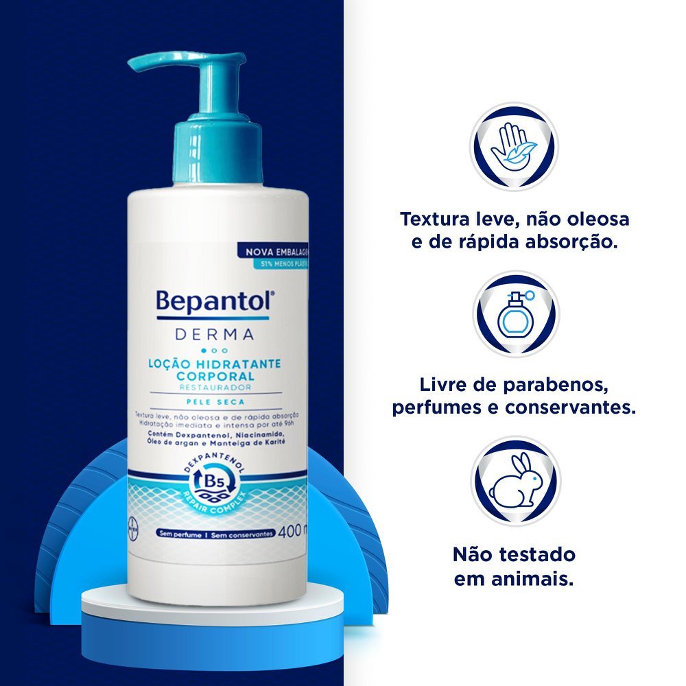 BEPANTOL DERMA LOÇÃO CORPORAL HIDRATANTE RESTAURADOR Hidrate sua pele com o novo Bepantol Derma Hidratante Restaurador Diário. Sua fórmula promove uma hidratação imediata e duradoura por até 48 horas*