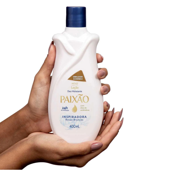 Loção Corporal Deo Hidratante Paixão Inspiradora Rosas Brancas 400ml. Hidrata e perfuma a pele com fragrância envolvente de rosas brancas. Textura leve, rápida absorção e toque aveludado. Ideal para uso diário e pele macia por mais tempo.