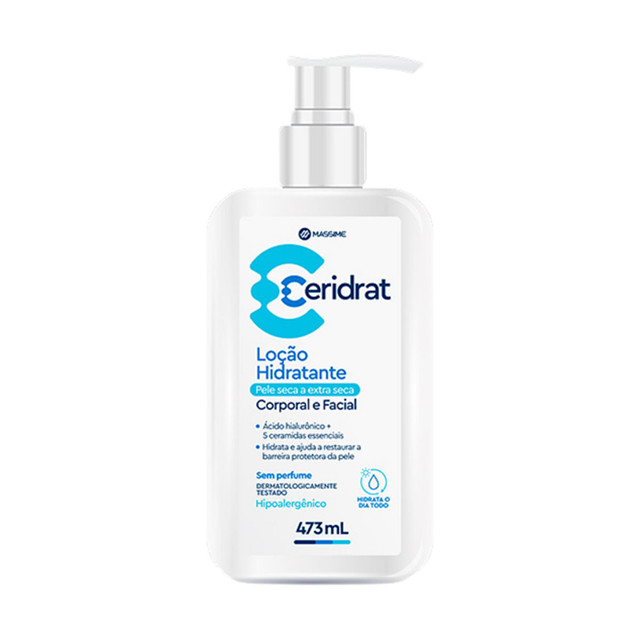 Loção Corporal e Facial Ceridrat 473ml CERIDRAT é uma linha de hidratantes de alta performance a base de 5 Ceramidas e Ácido Hialurônico, para o cuidado que respeita a biologia da pele. Suas fórmulas são dermatologicamente testadas, seguras e eficazes na restauração e manutenção da barreira protetora da pele.