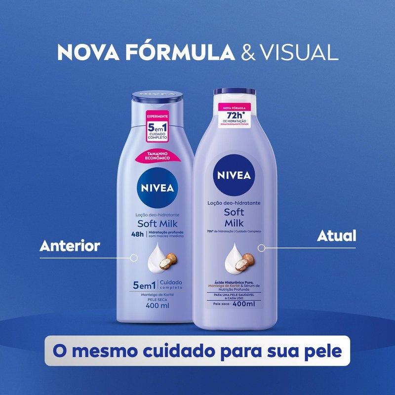 Hidratante Desodorante Nivea Soft Milk 400ml - Hidratação Intensa por 48 Horas Nivea Loção Deo-Hidratante Soft Milk é um hidratante corporal que garante um cuidado completo, com 72 horas de hidratação para uma pele mais saudável a cada uso. Para que serve? Enriquecida com ácido hialurônico puro, manteiga de karité e sérum de nutrição profunda, a loção deo-hidratante proporciona uma hidratação completa para a pele seca. Benefícios - Hidratação por 72 horas - Cuidado completo - Nutrição profunda - Não oleoso e de rápida absorção - Dermatologicamente testado Como usar o Hidratante Desodorante Nivea Soft Milk? -Após o banho, aplique o hidratante sobre a pele limpa e seca. -Massageie suavemente em movimentos circulares até completa absorção. -Utilize diariamente, especialmente nas áreas mais ressecadas como cotovelos, joelhos e pés. Dicas para potencializar os resultados: 1.Faça uma esfoliação corporal semanal para remover células mortas e melhorar a absorção. 2.Aplique logo após o banho, quando a pele ainda está levemente úmida. Perguntas Frequentes 1. O Nivea Soft Milk é indicado para todos os tipos de pele? É especialmente formulado para peles secas, mas pode ser usado por outros tipos de pele que necessitam de hidratação intensa. 2. Ele realmente hidrata por 72 horas? Sim, sua fórmula foi desenvolvida para proporcionar hidratação prolongada e comprovada. 3. O hidratante pode ser usado no rosto? Embora seja seguro, é mais indicado para o corpo. Para o rosto, prefira produtos específicos da linha facial Nivea. 4. Possui fragrância? Sim, tem uma fragrância suave e agradável que proporciona frescor ao longo do dia. 5. Ele deixa a pele pegajosa? Não, sua textura cremosa é de rápida absorção e não deixa resíduos oleosos. 6. É seguro para uso diário? Sim, o hidratante é dermatologicamente testado e ideal para uso diário. 7. Pode ser usado em climas quentes? Sim, sua fórmula leve e de rápida absorção é confortável mesmo em climas mais quentes. Encontre na o Hidratante Desodorante Nivea, o aliado perfeito para quem busca hidratação intensa e cuidado diário para peles secas. Com manteiga de karité e ação desodorante, ele oferece maciez, frescor e proteção por até 72 horas, garantindo uma pele saudável e bem cuidada.